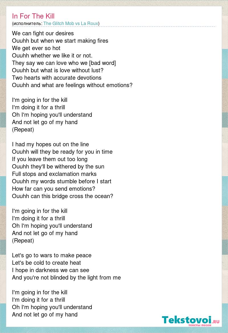 We can fight our desires Ouuhh but when we start making fires We get ever so hot Ouuhh whether we like it or not. They say we can love who we [bad word] Ouuhh but what is love without lust? Two hearts with accurate devotions Ouuhh and what are feelings without emotions? I'm going in for the kill I'm doing it for a thrill Oh I'm hoping you'll understand And not let go of my hand (Repeat) I had my hopes out on the line Ouuhh will they be ready for you in time If you leave them out too long Ouuhh they'll be withered by the sun Full stops and exclamation marks Ouuhh my words stumble before I start How far can you send emotions? Ouuhh can this bridge cross the ocean? I'm going in for the kill I'm doing it for a thrill Oh I'm hoping you'll understand And not let go of my hand (Repeat) Let's go to wars to make peace Let's be cold to create heat I hope in darkness we can see And you're not blinded by the light from me I'm going in for the kill I'm doing it for a thrill Oh I'm hoping you'll understand And not let go of my hand
