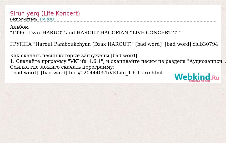 Альбом "1996 - Dzax HARUOT and HAROUT HAGOPIAN ''LIVE CONCERT 2''" ГРУППА "Harout Pamboukchyan (Dzax HAROUT)" [bad word] [bad word] club30794 Как скачать песни которые загружены [bad word] 1. Скачайте прграмму "VKLife_1.6.1", и скачивайте песнм из раздела "Аудиозаписи". Ссылка где можнго скачать порограмму: [bad word] [bad word] files/120444051/VKLife_1.6.1.exe.html.