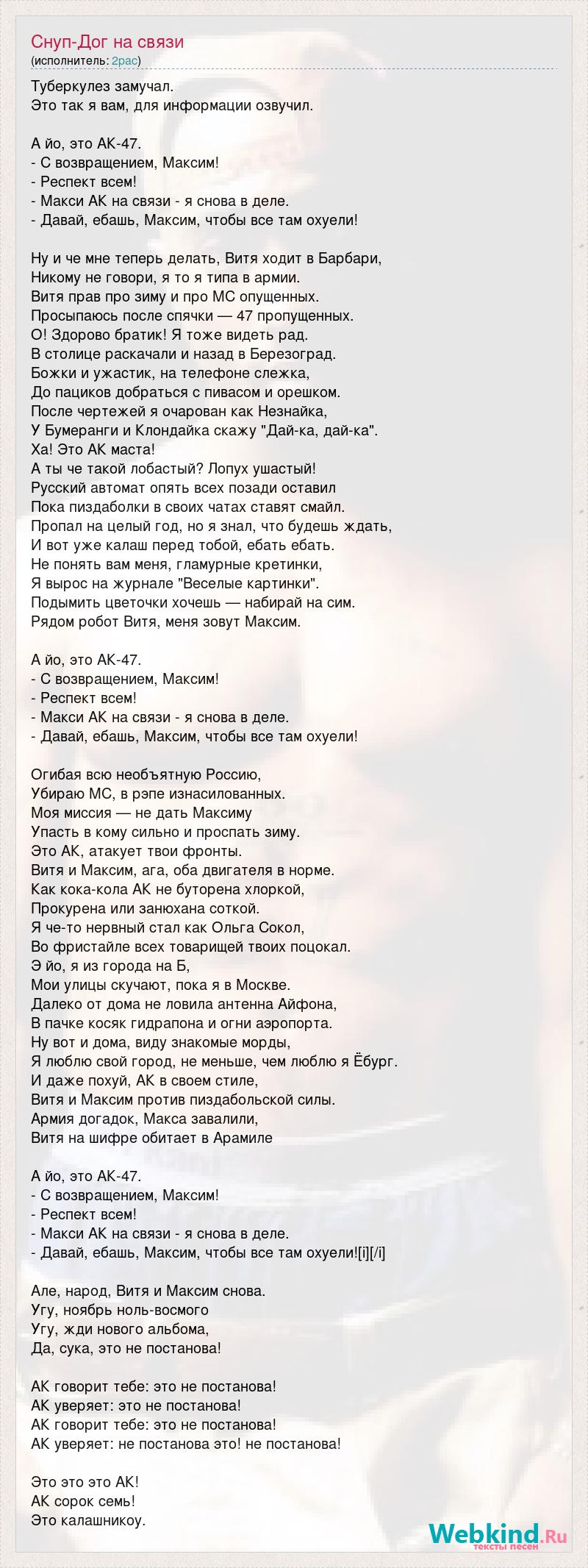 Туберкулез замучал. Это так я вам, для информации озвучил. А йо, это АК-47. - С возвращением, Максим! - Респект всем! - Макси АК на связи - я снова в деле. - Давай, ебашь, Максим, чтобы все там охуели! Ну и че мне теперь делать, Витя ходит в Барбари, Никому не говори, я то я типа в армии. Витя прав про зиму и про MC опущенных. Просыпаюсь после спячки — 47 пропущенных. О! Здорово братик! Я тоже видеть рад. В столице раскачали и назад в Березоград. Божки и ужастик, на телефоне слежка, До пациков добраться с пивасом и орешком. После чертежей я очарован как Незнайка, У Бумеранги и Клондайка скажу "Дай-ка, дай-ка". Ха! Это АК маста! А ты че такой лобастый? Лопух ушастый! Русский автомат опять всех позади оставил Пока пиздаболки в своих чатах ставят смайл. Пропал на целый год, но я знал, что будешь ждать, И вот уже калаш перед тобой, ебать ебать. Не понять вам меня, гламурные кретинки, Я вырос на журнале "Веселые картинки". Подымить цветочки хочешь — набирай на сим. Рядом робот Витя, меня зовут Максим. А йо, это АК-47. - С возвращением, Максим! - Респект всем! - Макси АК на связи - я снова в деле. - Давай, ебашь, Максим, чтобы все там охуели! Огибая всю необъятную Россию, Убираю MC, в рэпе изнасилованных. Моя миссия — не дать Максиму Упасть в кому сильно и проспать зиму. Это АК, атакует твои фронты. Витя и Максим, ага, оба двигателя в норме. Как кока-кола АК не буторена хлоркой, Прокурена или занюхана соткой. Я че-то нервный стал как Ольга Сокол, Во фристайле всех товарищей твоих поцокал. Э йо, я из города на Б, Мои улицы скучают, пока я в Москве. Далеко от дома не ловила антенна Айфона, В пачке косяк гидрапона и огни аэропорта. Ну вот и дома, виду знакомые морды, Я люблю свой город, не меньше, чем люблю я Ёбург. И даже похуй, АК в своем стиле, Витя и Максим против пиздабольской силы. Армия догадок, Макса завалили, Витя на шифре обитает в Арамиле А йо, это АК-47. - С возвращением, Максим! - Респект всем! - Макси АК на связи - я снова в деле. - Давай, ебашь, Максим, чтобы все там охуели![i][/i] Але, народ, Витя и Максим снова. Угу, ноябрь ноль-восмого Угу, жди нового альбома, Да, сука, это не постанова! АК говорит тебе: это не постанова! АК уверяет: это не постанова! АК говорит тебе: это не постанова! АК уверяет: не постанова это! не постанова! Это это это АК! АК сорок семь! Это калашникоу.