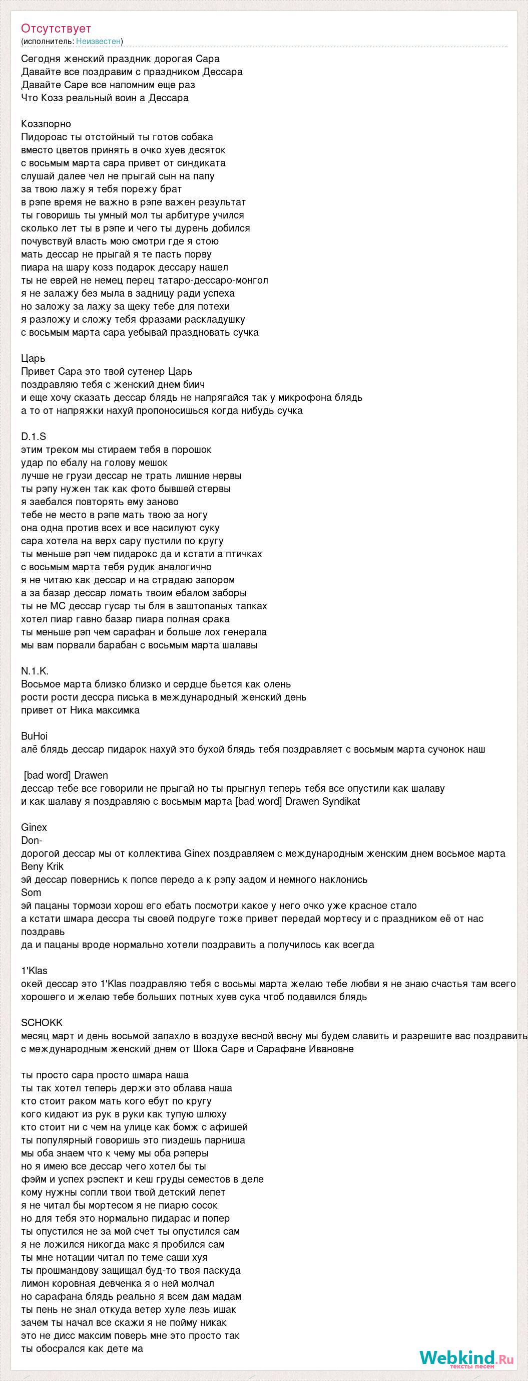 Сегодня женский праздник дорогая Сара Давайте все поздравим с праздником Дессара Давайте Саре все напомним еще раз Что Козз реальный воин а Дессара Коззпорно Пидороас ты отстойный ты готов собака вместо цветов принять в очко хуев десяток с восьмым марта сара привет от синдиката слушай далее чел не прыгай сын на папу за твою лажу я тебя порежу брат в рэпе время не важно в рэпе важен результат ты говоришь ты умный мол ты арбитуре учился сколько лет ты в рэпе и чего ты дурень добился почувствуй власть мою смотри где я стою мать дессар не прыгай я те пасть порву пиара на шару козз подарок дессару нашел ты не еврей не немец перец татаро-дессаро-монгол я не залажу без мыла в задницу ради успеха но заложу за лажу за щеку тебе для потехи я разложу и сложу тебя фразами раскладушку с восьмым марта сара уебывай праздновать сучка Царь Привет Сара это твой сутенер Царь поздравляю тебя с женский днем биич и еще хочу сказать дессар блядь не напрягайся так у микрофона блядь а то от напряжки нахуй пропоносишься когда нибудь сучка D.1.S этим треком мы стираем тебя в порошок удар по ебалу на голову мешок лучше не грузи дессар не трать лишние нервы ты рэпу нужен так как фото бывшей стервы я заебался повторять ему заново тебе не место в рэпе мать твою за ногу она одна против всех и все насилуют суку сара хотела на верх сару пустили по кругу ты меньше рэп чем пидарокс да и кстати а птичках с восьмым марта тебя рудик аналогично я не читаю как дессар и на страдаю запором а за базар дессар ломать твоим ебалом заборы ты не МС дессар гусар ты бля в заштопаных тапках хотел пиар гавно базар пиара полная срака ты меньше рэп чем сарафан и больше лох генерала мы вам порвали барабан с восьмым марта шалавы N.1.K. Восьмое марта близко близко и сердце бьется как олень рости рости дессра писька в международный женский день привет от Ника максимка BuHoi алё блядь дессар пидарок нахуй это бухой блядь тебя поздравляет с восьмым марта сучонок наш [bad word] Drawen дессар тебе все говорили не прыгай но ты прыгнул теперь тебя все опустили как шалаву и как шалаву я поздравляю с восьмым марта [bad word] Drawen Syndikat Ginex Don- дорогой дессар мы от коллектива Ginex поздравляем с международным женским днем восьмое марта Beny Krik эй дессар повернись к попсе передо а к рэпу задом и немного наклонись Som эй пацаны тормози хорош его ебать посмотри какое у него очко уже красное стало а кстати шмара дессра ты своей подруге тоже привет передай мортесу и с праздником её от нас поздравь да и пацаны вроде нормально хотели поздравить а получилось как всегда 1'Klas окей дессар это 1'Klas поздравляю тебя с восьмы марта желаю тебе любви я не знаю счастья там всего хорошего и желаю тебе больших потных хуев сука чтоб подавился блядь SCHOKK месяц март и день восьмой запахло в воздухе весной весну мы будем славить и разрешите вас поздравить с международным женский днем от Шока Саре и Сарафане Ивановне ты просто сара просто шмара наша ты так хотел теперь держи это облава наша кто стоит раком мать кого ебут по кругу кого кидают из рук в руки как тупую шлюху кто стоит ни с чем на улице как бомж с афишей ты популярный говоришь это пиздешь парниша мы оба знаем что к чему мы оба рэперы но я имею все дессар чего хотел бы ты фэйм и успех рэспект и кеш груды семестов в деле кому нужны сопли твои твой детский лепет я не читал бы мортесом я не пиарю сосок но д