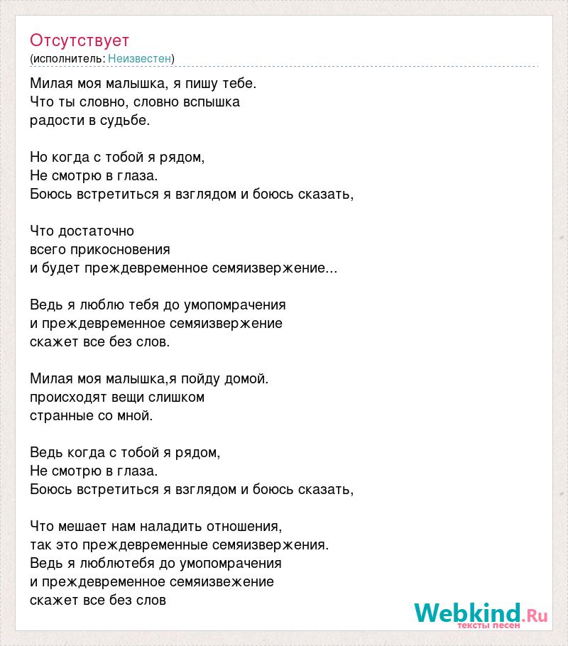 Милая моя малышка, я пишу тебе. Что ты словно, словно вспышка радости в судьбе. Но когда с тобой я рядом, Не смотрю в глаза. Боюсь встретиться я взглядом и боюсь сказать, Что достаточно всего прикосновения и будет преждевременное семяизвержение... Ведь я люблю тебя до умопомрачения и преждевременное семяизвержение скажет все без слов. Милая моя малышка,я пойду домой. происходят вещи слишком странные со мной. Ведь когда с тобой я рядом, Не смотрю в глаза. Боюсь встретиться я взглядом и боюсь сказать, Что мешает нам наладить отношения, так это преждевременные семяизвержения. Ведь я люблютебя до умопомрачения и преждевременное семяизвежение скажет все без слов