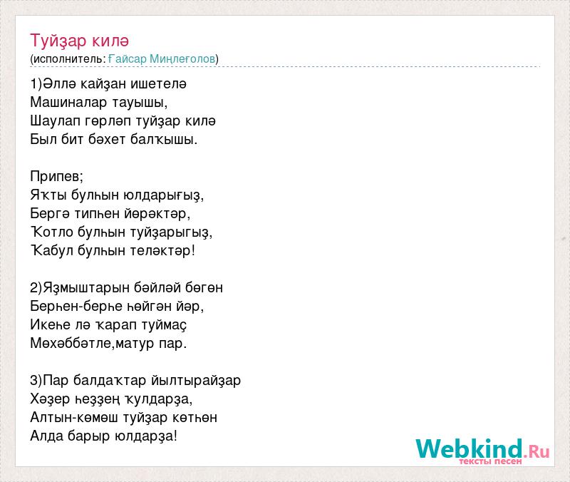 1)Әллә кайҙан ишетелә Машиналар тауышы, Шаулап гөрләп туйҙар килә Был бит бәхет балҡышы. Припев; Яҡты булһын юлдарығыҙ, Бергә типһен йөрәктәр, Ҡотло булһын туйҙарыгыҙ, Ҡабул булһын теләктәр! 2)Яҙмыштарын бәйләй бөгөн Берһен-берһе һөйгән йәр, Икеһе лә ҡарап туймаҫ Мөхәббәтле,матур пар. 3)Пар балдаҡтар йылтырайҙар Хәҙер һеҙҙең ҡулдарҙа, Алтын-көмөш туйҙар көтһөн Алда барыр юлдарҙа!