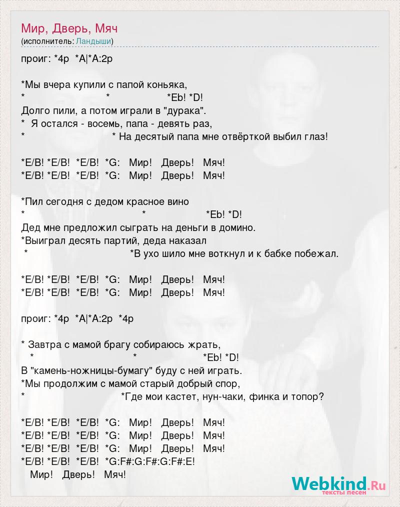 проиг: *4p *A|*A:2p *Мы вчера купили с папой коньяка, * * *Eb! *D! Долго пили, а потом играли в "дурака". * Я остался - восемь, папа - девять раз, * * На десятый папа мне отвёрткой выбил глаз! *E/B! *E/B! *E/B! *G: Мир! Дверь! Мяч! *E/B! *E/B! *E/B! *G: Мир! Дверь! Мяч! *Пил сегодня с дедом красное вино * * *Eb! *D! Дед мне предложил сыграть на деньги в домино. *Выиграл десять партий, деда наказал * *В ухо шило мне воткнул и к бабке побежал. *E/B! *E/B! *E/B! *G: Мир! Дверь! Мяч! *E/B! *E/B! *E/B! *G: Мир! Дверь! Мяч! проиг: *4p *A|*A:2p *4p * Завтра с мамой брагу собираюсь жрать, * * *Eb! *D! В "камень-ножницы-бумагу" буду с ней играть. *Мы продолжим с мамой старый добрый спор, * *Где мои кастет, нун-чаки, финка и топор? *E/B! *E/B! *E/B! *G: Мир! Дверь! Мяч! *E/B! *E/B! *E/B! *G: Мир! Дверь! Мяч! *E/B! *E/B! *E/B! *G: Мир! Дверь! Мяч! *E/B! *E/B! *E/B! *G:F#:G:F#:G:F#:E! Мир! Дверь! Мяч!