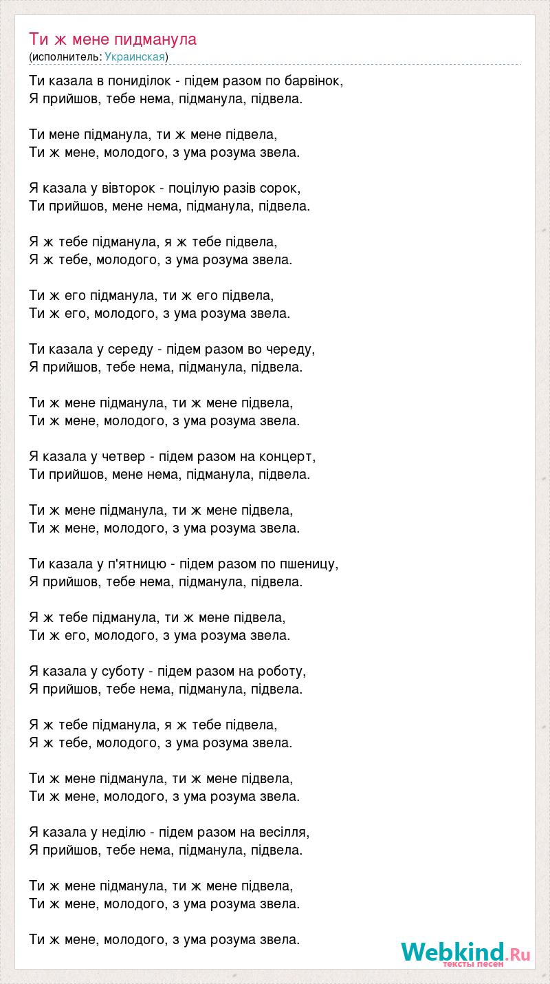 Ти казала в понидiлок - пiдем разом по барвiнок, Я прийшов, тебе нема, пiдманула, пiдвела. Ти мене пiдманула, ти ж мене пiдвела, Ти ж мене, молодого, з ума розума звела. Я казала у вiвторок - поцiлую разiв сорок, Ти прийшов, мене нема, пiдманула, пiдвела. Я ж тебе пiдманула, я ж тебе пiдвела, Я ж тебе, молодого, з ума розума звела. Ти ж его пiдманула, ти ж его пiдвела, Ти ж его, молодого, з ума розума звела. Ти казала у середу - пiдем разом во череду, Я прийшов, тебе нема, пiдманула, пiдвела. Ти ж мене пiдманула, ти ж мене пiдвела, Ти ж мене, молодого, з ума розума звела. Я казала у четвер - пiдем разом на концерт, Ти прийшов, мене нема, пiдманула, пiдвела. Ти ж мене пiдманула, ти ж мене пiдвела, Ти ж мене, молодого, з ума розума звела. Ти казала у п'ятницю - пiдем разом по пшеницу, Я прийшов, тебе нема, пiдманула, пiдвела. Я ж тебе пiдманула, ти ж мене пiдвела, Ти ж его, молодого, з ума розума звела. Я казала у суботу - пiдем разом на роботу, Я прийшов, тебе нема, пiдманула, пiдвела. Я ж тебе пiдманула, я ж тебе пiдвела, Я ж тебе, молодого, з ума розума звела. Ти ж мене пiдманула, ти ж мене пiдвела, Ти ж мене, молодого, з ума розума звела. Я казала у недiлю - пiдем разом на весiлля, Я прийшов, тебе нема, пiдманула, пiдвела. Ти ж мене пiдманула, ти ж мене пiдвела, Ти ж мене, молодого, з ума розума звела. Ти ж мене, молодого, з ума розума звела.