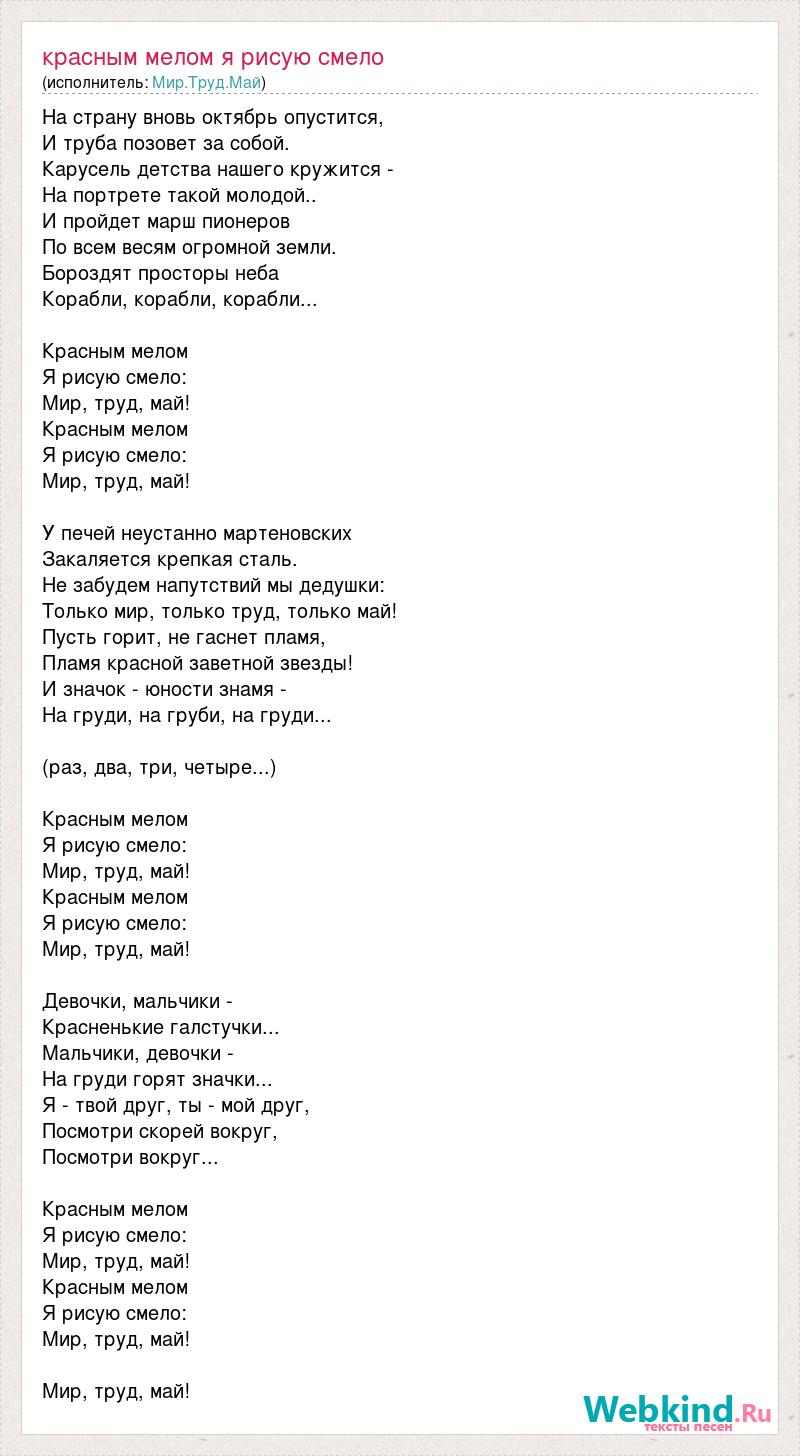 На страну вновь октябрь опустится, И труба позовет за собой. Карусель детства нашего кружится - На портрете такой молодой.. И пройдет марш пионеров По всем весям огромной земли. Бороздят просторы неба Корабли, корабли, корабли... Красным мелом Я рисую смело: Мир, труд, май! Красным мелом Я рисую смело: Мир, труд, май! У печей неустанно мартеновских Закаляется крепкая сталь. Не забудем напутствий мы дедушки: Только мир, только труд, только май! Пусть горит, не гаснет пламя, Пламя красной заветной звезды! И значок - юности знамя - На груди, на груби, на груди... (раз, два, три, четыре...) Красным мелом Я рисую смело: Мир, труд, май! Красным мелом Я рисую смело: Мир, труд, май! Девочки, мальчики - Красненькие галстучки... Мальчики, девочки - На груди горят значки... Я - твой друг, ты - мой друг, Посмотри скорей вокруг, Посмотри вокруг... Красным мелом Я рисую смело: Мир, труд, май! Красным мелом Я рисую смело: Мир, труд, май! Мир, труд, май!