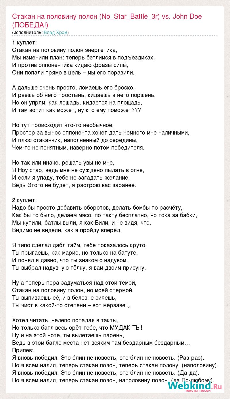 1 куплет: Стакан на половину полон энергетика, Мы изменили план: теперь бэтлимся в подъездиках, И против оппонентика кидаю фразы силы, Они попали прямо в цель – мы его поразили. А дальше очень просто, ломаешь его броско, И рвёшь об него простынь, кидаешь в него поршень, Но он упрям, как лошадь, кидается на площадь, И там вопит как может, ну кто ему поможет??? Но тут происходит что-то необычное, Простор за вынос оппонента хочет дать немного мне наличными, И плюс стаканчик, наполненный до середины, Чем-то не понятным, наверно потом победителя. Но так или иначе, решать увы не мне, Я Ноу стар, ведь мне не суждено пылать в огне, И если я упаду, тебе не загадать желание, Ведь Этого не будет, я растрою вас заранее. 2 куплет: Надо бы просто добавить оборотов, делать бомбы по расчёту, Как бы то было, делаем мясо, по такту бесплатно, но тока за бабки, Мы купили, батлы выли, я как Вили, и не видя, что, Видимо не видели, как я пройду вперёд. Я типо сделал дабл тайм, тебе показалось круто, Ты прыгаешь, как марио, но только на батуте, И понял я давно, что ты знаком с надувом, Ты выбрал надувную тёлку, я вам двоим присуну. Ну а теперь пора задуматься над этой темой, Стакан на половину полон, но моей спермой, Ты выпиваешь её, и в белезне сияешь, Ты чист в какой-то степени – вот мерзавец, Хотел читать, нелепо попадая в такты, Но только батл весь орёт тебе, что МУДАК ТЫ! Ну и на этой ноте, ты вылетаешь парень, Ведь в этом батле места нет всяким там бездарным бездарным… Припев: Я вновь победил. Это блин не новость, это блин не новость. (Раз-раз). Но я всем налил, теперь стакан полон, теперь стакан полону. (наполовину). Я вновь победил. Это блин не новость, это блин не новость. (Да-да). Но я всем налил, теперь стакан полон, наполовину полон, (да По-любому).
