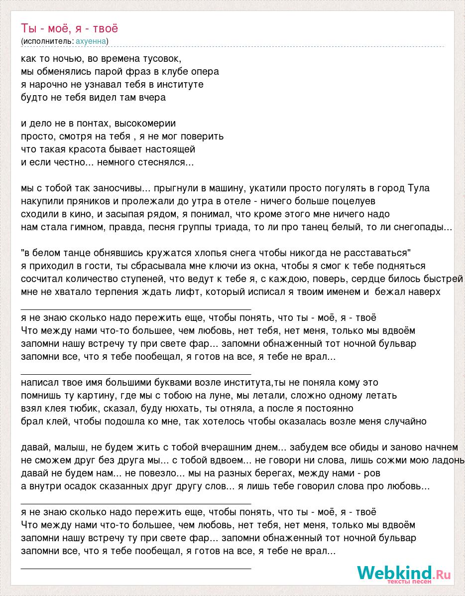 как то ночью, во времена тусовок, мы обменялись парой фраз в клубе опера я нарочно не узнавал тебя в институте будто не тебя видел там вчера и дело не в понтах, высокомерии просто, смотря на тебя , я не мог поверить что такая красота бывает настоящей и если честно... немного стеснялся... мы с тобой так заносчивы... прыгнули в машину, укатили просто погулять в город Тула накупили пряников и пролежали до утра в отеле - ничего больше поцелуев сходили в кино, и засыпая рядом, я понимал, что кроме этого мне ничего надо нам стала гимном, правда, песня группы триада, то ли про танец белый, то ли снегопады... "в белом танце обнявшись кружатся хлопья снега чтобы никогда не расставаться" я приходил в гости, ты сбрасывала мне ключи из окна, чтобы я смог к тебе подняться сосчитал количество ступеней, что ведут к тебе я, с каждою, поверь, сердце билось быстрей мне не хватало терпения ждать лифт, который исписал я твоим именем и бежал наверх __________________________________________ я не знаю сколько надо пережить еще, чтобы понять, что ты - моё, я - твоё Что между нами что-то большее, чем любовь, нет тебя, нет меня, только мы вдвоём запомни нашу встречу ту при свете фар... запомни обнаженный тот ночной бульвар запомни все, что я тебе пообещал, я готов на все, я тебе не врал... __________________________________________ написал твое имя большими буквами возле института,ты не поняла кому это помнишь ту картину, где мы с тобою на луне, мы летали, сложно одному летать взял клея тюбик, сказал, буду нюхать, ты отняла, а после я постоянно брал клей, чтобы подошла ко мне, так хотелось чтобы оказалась возле меня случайно давай, малыш, не будем жить с тобой вчерашним днем... забудем все обиды и заново начнем не сможем друг без друга мы... с тобой вдвоем... не говори ни слова, лишь сожми мою ладонь давай не будем нам... не повезло... мы на разных берегах, между нами - ров а внутри осадок сказанных друг другу слов... я лишь тебе говорил слова про любовь... __________________________________________ я не знаю сколько надо пережить еще, чтобы понять, что ты - моё, я - твоё Что между нами что-то большее, чем любовь, нет тебя, нет меня, только мы вдвоём запомни нашу встречу ту при свете фар... запомни обнаженный тот ночной бульвар запомни все, что я тебе пообещал, я готов на все, я тебе не врал... __________________________________________