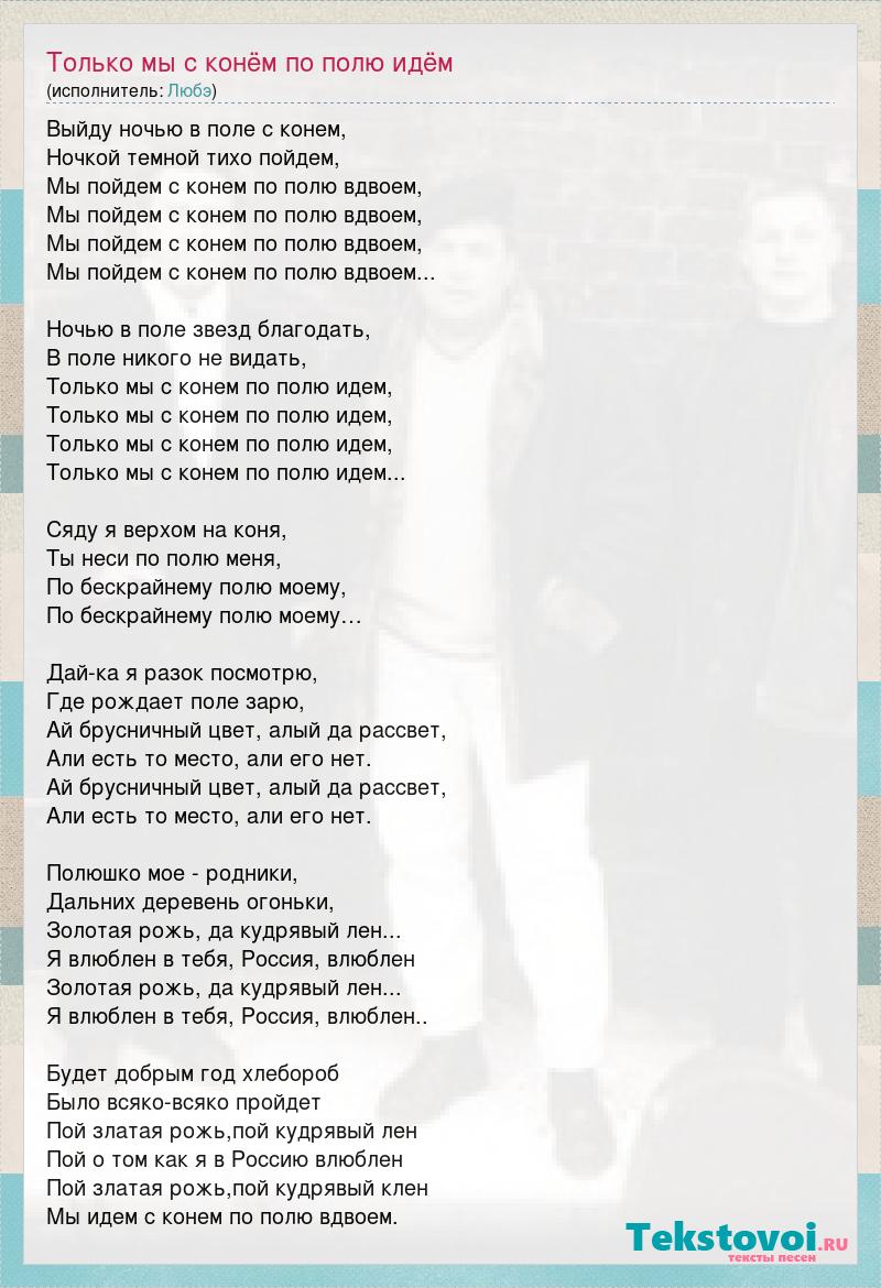 Выйду ночью в поле с конем, Ночкой темной тихо пойдем, Мы пойдем с конем по полю вдвоем, Мы пойдем с конем по полю вдвоем, Мы пойдем с конем по полю вдвоем, Мы пойдем с конем по полю вдвоем... Ночью в поле звезд благодать, В поле никого не видать, Только мы с конем по полю идем, Только мы с конем по полю идем, Только мы с конем по полю идем, Только мы с конем по полю идем... Сяду я верхом на коня, Ты неси по полю меня, По бескрайнему полю моему, По бескрайнему полю моему… Дай-ка я разок посмотрю, Где рождает поле зарю, Ай брусничный цвет, алый да рассвет, Али есть то место, али его нет. Ай брусничный цвет, алый да рассвет, Али есть то место, али его нет. Полюшко мое - родники, Дальних деревень огоньки, Золотая рожь, да кудрявый лен... Я влюблен в тебя, Россия, влюблен Золотая рожь, да кудрявый лен... Я влюблен в тебя, Россия, влюблен.. Будет добрым год хлебороб Было всяко-всяко пройдет Пой златая рожь,пой кудрявый лен Пой о том как я в Россию влюблен Пой златая рожь,пой кудрявый клен Мы идем с конем по полю вдвоем.