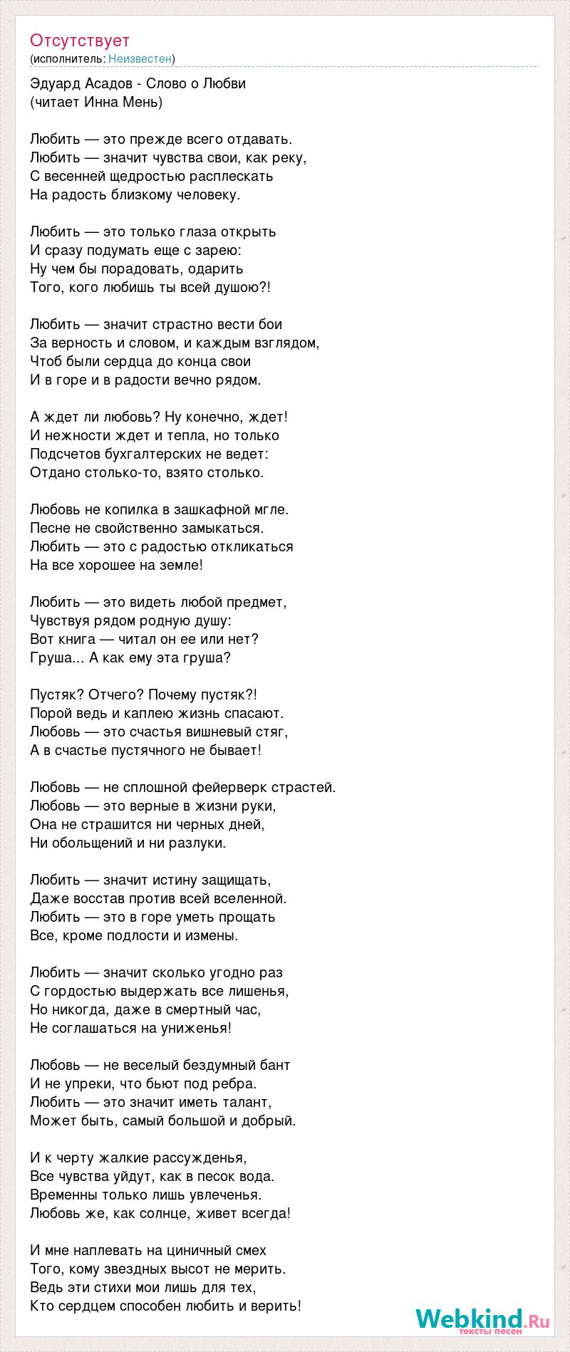 Эдуард Асадов - Слово о Любви (читает Инна Мень) Любить — это прежде всего отдавать. Любить — значит чувства свои, как реку, С весенней щедростью расплескать На радость близкому человеку. Любить — это только глаза открыть И сразу подумать еще с зарею: Ну чем бы порадовать, одарить Того, кого любишь ты всей душою?! Любить — значит страстно вести бои За верность и словом, и каждым взглядом, Чтоб были сердца до конца свои И в горе и в радости вечно рядом. А ждет ли любовь? Ну конечно, ждет! И нежности ждет и тепла, но только Подсчетов бухгалтерских не ведет: Отдано столько-то, взято столько. Любовь не копилка в зашкафной мгле. Песне не свойственно замыкаться. Любить — это с радостью откликаться На все хорошее на земле! Любить — это видеть любой предмет, Чувствуя рядом родную душу: Вот книга — читал он ее или нет? Груша... А как ему эта груша? Пустяк? Отчего? Почему пустяк?! Порой ведь и каплею жизнь спасают. Любовь — это счастья вишневый стяг, А в счастье пустячного не бывает! Любовь — не сплошной фейерверк страстей. Любовь — это верные в жизни руки, Она не страшится ни черных дней, Ни обольщений и ни разлуки. Любить — значит истину защищать, Даже восстав против всей вселенной. Любить — это в горе уметь прощать Все, кроме подлости и измены. Любить — значит сколько угодно раз С гордостью выдержать все лишенья, Но никогда, даже в смертный час, Не соглашаться на униженья! Любовь — не веселый бездумный бант И не упреки, что бьют под ребра. Любить — это значит иметь талант, Может быть, самый большой и добрый. И к черту жалкие рассужденья, Все чувства уйдут, как в песок вода. Временны только лишь увлеченья. Любовь же, как солнце, живет всегда! И мне наплевать на циничный смех Того, кому звездных высот не мерить. Ведь эти стихи мои лишь для тех, Кто сердцем способен любить и верить!