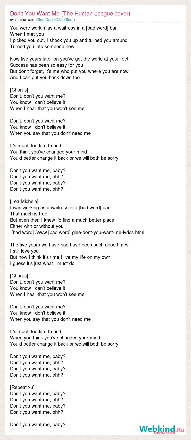 You were workin’ as a waitress in a [bad word] bar When I met you I picked you out, I shook you up and turned you around Turned you into someone new Now five years later on you’ve got the world at your feet Success has been so easy for you But don’t forget, it’s me who put you where you are now And I can put you back down too [Chorus] Don’t, don’t you want me? You know I can’t believe it When I hear that you won’t see me Don’t, don’t you want me? You know I don’t believe it When you say that you don’t need me It’s much too late to find You think you’ve changed your mind You’d better change it back or we will both be sorry Don’t you want me, baby? Don’t you want me, ohh? Don’t you want me, baby? Don’t you want me, ohh? [Lea Michele] I was working as a waitress in a [bad word] bar That much is true But even then I knew I’d find a much better place Either with or without you [bad word] /www [bad word] glee-dont-you-want-me-lyrics.html The five years we have had have been such good times I still love you But now I think it’s time I live my life on my own I guess it’s just what I must do [Chorus] Don’t, don’t you want me? You know I can’t believe it When I hear that you won’t see me Don’t, don’t you want me? You know I don’t believe it When you say that you don’t need me It’s much too late to find When you think you’ve changed your mind You’d better change it back or we will both be sorry Don’t you want me, baby? Don’t you want me, ohh? Don’t you want me, baby? Don’t you want me, ohh? [Repeat x3] Don’t you want me, baby? Don’t you want me, ohh? Don’t you want me, baby? Don’t you want me, ohh? Don’t you want me, baby?