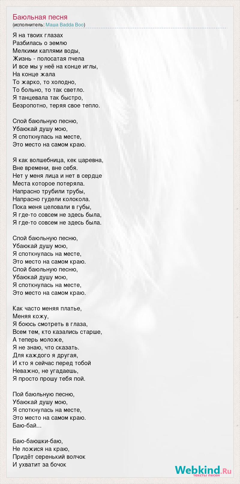 Я на твоих глазах Разбилась о землю Мелкими каплями воды, Жизнь - полосатая пчела И все мы у неё на конце иглы, На конце жала То жарко, то холодно, То больно, то так светло. Я танцевала так быстро, Безропотно, теряя свое тепло. Спой баюльную песню, Убаюкай душу мою, Я споткнулась на месте, Это место на самом краю. Я как волшебница, кек царевна, Вне времени, вне себя. Нет у меня лица и нет в сердце Места которое потеряла. Напрасно трубили трубы, Напрасно гудели колокола. Пока меня целовали в губы, Я где-то совсем не здесь была, Я где-то совсем не здесь была. Спой баюльную песню, Убаюкай душу мою, Я споткнулась на месте, Это место на самом краю. Спой баюльную песню, Убаюкай душу мою, Я споткнулась на месте, Это место на самом краю. Как часто меняя платье, Меняя кожу, Я боюсь смотреть в глаза, Всем тем, кто казались старше, А теперь моложе, Я не знаю, что сказать. Для каждого я другая, И кто я сейчас перед тобой Неважно, не угадаешь, Я просто прошу тебя пой. Пой баюльную песню, Убаюкай душу мою, Я споткнулась на месте, Это место на самом краю. Баю-бай... Баю-баюшки-баю, Не ложися на краю, Придёт серенький волчок И ухватит за бочок