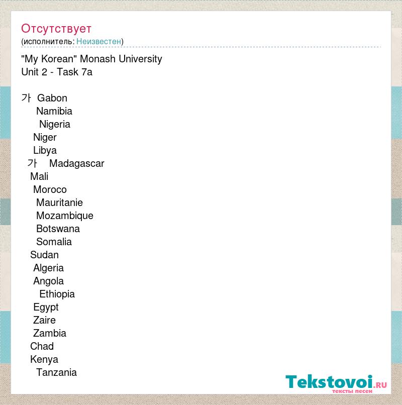 "My Korean" Monash University Unit 2 - Task 7a 가봉 Gabon 나미비아 Namibia 나이지리아 Nigeria 니제르 Niger 리비아 Libya 마다가스카르 Madagascar 말리 Mali 모로코 Moroco 모리타니 Mauritanie 모잠비크 Mozambique 보츠와나 Botswana 소말리아 Somalia 수단 Sudan 알제리 Algeria 앙골라 Angola 에티오피아 Ethiopia 이집트 Egypt 자이르 Zaire 잠비아 Zambia 차드 Chad 케냐 Kenya 탄자니아 Tanzania