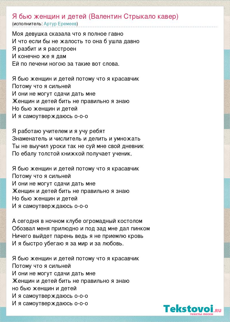 Моя девушка сказала что я полное гавно И что если бы не жалость то она б ушла давно Я разбит и я расстроен И конечно же я дам Ей по печени ногою за такие вот слова. Я бью женщин и детей потому что я красавчик Потому что я сильней И они не могут сдачи дать мне Женщин и детей бить не правильно я знаю Но бью женщин и детей И я самоутверждаюсь о-о-о Я работаю учителем и я учу ребят Знаменатель и числитель и делить и умножать Ты не выучил уроки так не суй мне свой дневник По ебалу толстой книжкой получает ученик. Я бью женщин и детей потому что я красавчик Потому что я сильней И они не могут сдачи дать мне Женщин и детей бить не правильно я знаю Но бью женщин и детей И я самоутверждаюсь о-о-о А сегодня в ночном клубе огромадный костолом Обозвал меня прилюдно и под зад мне дал пинком Ничего выйдет парень ведь я не приемлю кровь И я быстро убегаю я за мир и за любовь. Я бью женщин и детей потому что я красавчик Потому что я сильней И они не могут сдачи дать мне Женщин и детей бить не правильно я знаю но бью женщин и детей И я самоутверждаюсь о-о-о И я самоутверждаюсь о-о-о