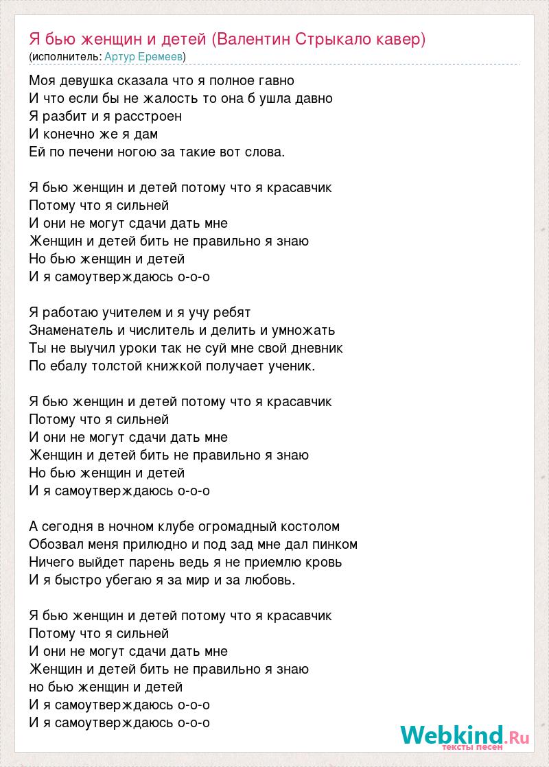 Моя девушка сказала что я полное гавно И что если бы не жалость то она б ушла давно Я разбит и я расстроен И конечно же я дам Ей по печени ногою за такие вот слова. Я бью женщин и детей потому что я красавчик Потому что я сильней И они не могут сдачи дать мне Женщин и детей бить не правильно я знаю Но бью женщин и детей И я самоутверждаюсь о-о-о Я работаю учителем и я учу ребят Знаменатель и числитель и делить и умножать Ты не выучил уроки так не суй мне свой дневник По ебалу толстой книжкой получает ученик. Я бью женщин и детей потому что я красавчик Потому что я сильней И они не могут сдачи дать мне Женщин и детей бить не правильно я знаю Но бью женщин и детей И я самоутверждаюсь о-о-о А сегодня в ночном клубе огромадный костолом Обозвал меня прилюдно и под зад мне дал пинком Ничего выйдет парень ведь я не приемлю кровь И я быстро убегаю я за мир и за любовь. Я бью женщин и детей потому что я красавчик Потому что я сильней И они не могут сдачи дать мне Женщин и детей бить не правильно я знаю но бью женщин и детей И я самоутверждаюсь о-о-о И я самоутверждаюсь о-о-о