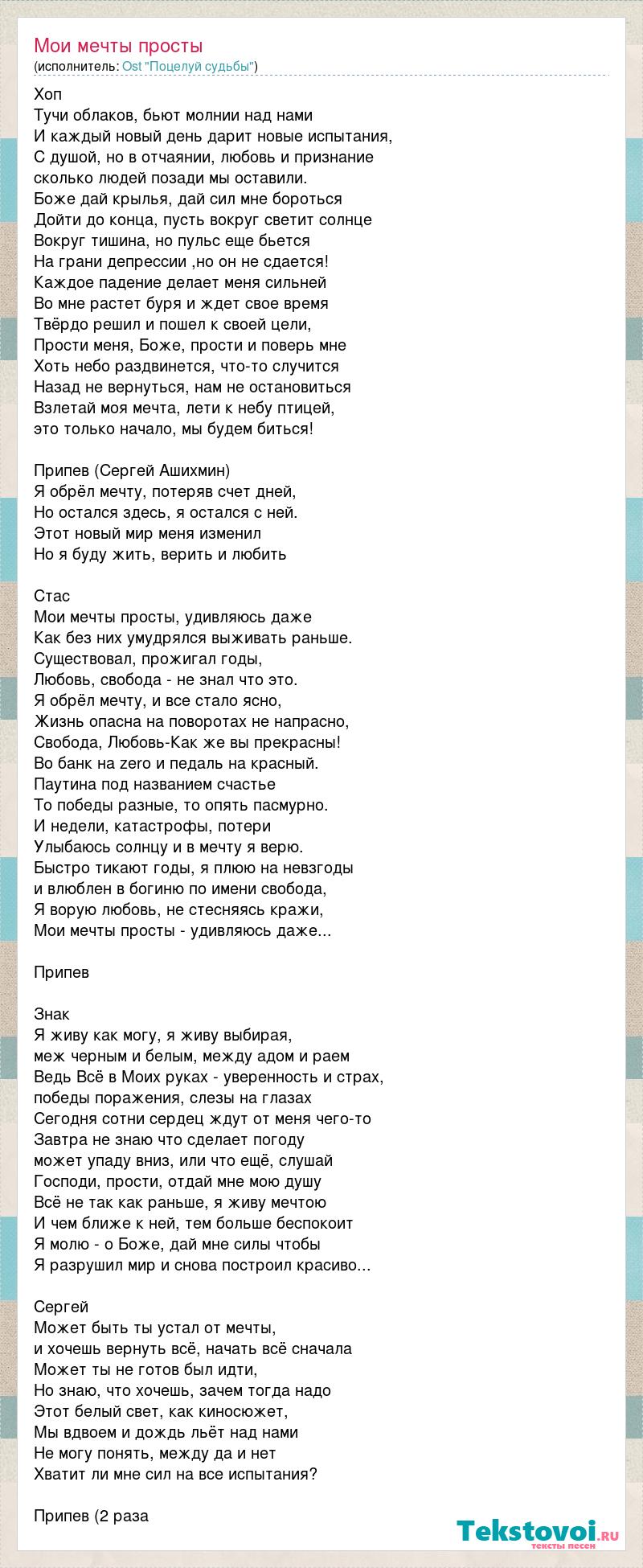 Хоп Тучи облаков, бьют молнии над нами И каждый новый день дарит новые испытания, С душой, но в отчаянии, любовь и признание сколько людей позади мы оставили. Боже дай крылья, дай сил мне бороться Дойти до конца, пусть вокруг светит солнце Вокруг тишина, но пульс еще бьется На грани депрессии ,но он не сдается! Каждое падение делает меня сильней Во мне растет буря и ждет свое время Твёрдо решил и пошел к своей цели, Прости меня, Боже, прости и поверь мне Хоть небо раздвинется, что-то случится Назад не вернуться, нам не остановиться Взлетай моя мечта, лети к небу птицей, это только начало, мы будем биться! Припев (Сергей Ашихмин) Я обрёл мечту, потеряв счет дней, Но остался здесь, я остался с ней. Этот новый мир меня изменил Но я буду жить, верить и любить Стас Мои мечты просты, удивляюсь даже Как без них умудрялся выживать раньше. Существовал, прожигал годы, Любовь, свобода - не знал что это. Я обрёл мечту, и все стало ясно, Жизнь опасна на поворотах не напрасно, Свобода, Любовь-Как же вы прекрасны! Во банк на zero и педаль на красный. Паутина под названием счастье То победы разные, то опять пасмурно. И недели, катастрофы, потери Улыбаюсь солнцу и в мечту я верю. Быстро тикают годы, я плюю на невзгоды и влюблен в богиню по имени свобода, Я ворую любовь, не стесняясь кражи, Мои мечты просты - удивляюсь даже... Припев Знак Я живу как могу, я живу выбирая, меж черным и белым, между адом и раем Ведь Всё в Моих руках - уверенность и страх, победы поражения, слезы на глазах Сегодня сотни сердец ждут от меня чего-то Завтра не знаю что сделает погоду может упаду вниз, или что ещё, слушай Господи, прости, отдай мне мою душу Всё не так как раньше, я живу мечтою И чем ближе к ней, тем больше беспокоит Я молю - о Боже, дай мне силы чтобы Я разрушил мир и снова построил красиво... Сергей Может быть ты устал от мечты, и хочешь вернуть всё, начать всё сначала Может ты не готов был идти, Но знаю, что хочешь, зачем тогда надо Этот белый свет, как киносюжет, Мы вдвоем и дождь льёт над нами Не могу понять, между да и нет Хватит ли мне сил на все испытания? Припев (2 раза