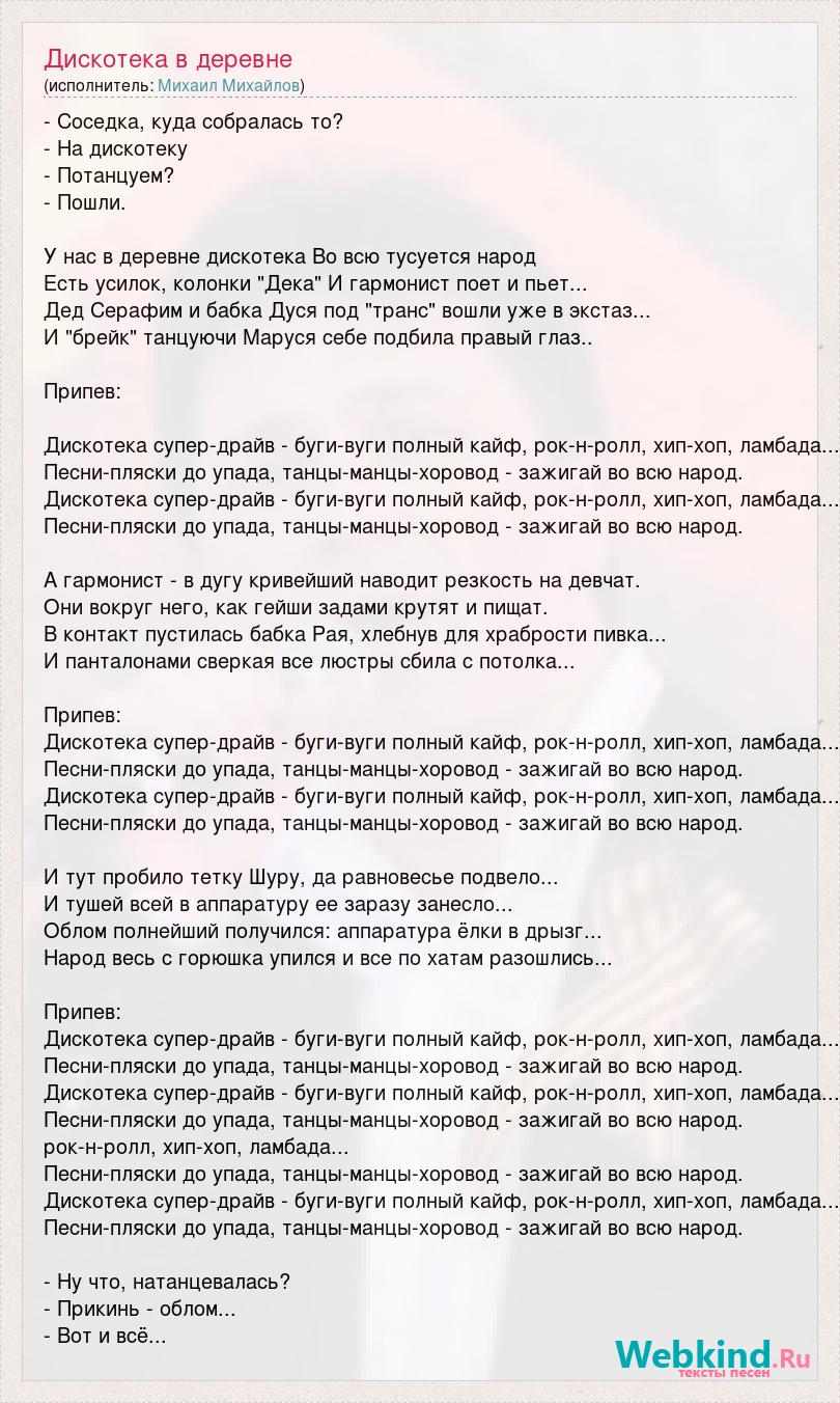 - Соседка, куда собралась то? - На дискотеку - Потанцуем? - Пошли. У нас в деревне дискотека Во всю тусуется народ Есть усилок, колонки "Дека" И гармонист поет и пьет... Дед Серафим и бабка Дуся под "транс" вошли уже в экстаз... И "брейк" танцуючи Маруся себе подбила правый глаз.. Припев: Дискотека супер-драйв - буги-вуги полный кайф, рок-н-ролл, хип-хоп, ламбада... Песни-пляски до упада, танцы-манцы-хоровод - зажигай во всю народ. Дискотека супер-драйв - буги-вуги полный кайф, рок-н-ролл, хип-хоп, ламбада... Песни-пляски до упада, танцы-манцы-хоровод - зажигай во всю народ. А гармонист - в дугу кривейший наводит резкость на девчат. Они вокруг него, как гейши задами крутят и пищат. В контакт пустилась бабка Рая, хлебнув для храбрости пивка... И панталонами сверкая все люстры сбила с потолка... Припев: Дискотека супер-драйв - буги-вуги полный кайф, рок-н-ролл, хип-хоп, ламбада... Песни-пляски до упада, танцы-манцы-хоровод - зажигай во всю народ. Дискотека супер-драйв - буги-вуги полный кайф, рок-н-ролл, хип-хоп, ламбада... Песни-пляски до упада, танцы-манцы-хоровод - зажигай во всю народ. И тут пробило тетку Шуру, да равновесье подвело... И тушей всей в аппаратуру ее заразу занесло... Облом полнейший получился: аппаратура ёлки в дрызг... Народ весь с горюшка упился и все по хатам разошлись... Припев: Дискотека супер-драйв - буги-вуги полный кайф, рок-н-ролл, хип-хоп, ламбада... Песни-пляски до упада, танцы-манцы-хоровод - зажигай во всю народ. Дискотека супер-драйв - буги-вуги полный кайф, рок-н-ролл, хип-хоп, ламбада... Песни-пляски до упада, танцы-манцы-хоровод - зажигай во всю народ. рок-н-ролл, хип-хоп, ламбада... Песни-пляски до упада, танцы-манцы-хоровод - зажигай во всю народ. Дискотека супер-драйв - буги-вуги полный кайф, рок-н-ролл, хип-хоп, ламбада... Песни-пляски до упада, танцы-манцы-хоровод - зажигай во всю народ. - Ну что, натанцевалась? - Прикинь - облом... - Вот и всё...