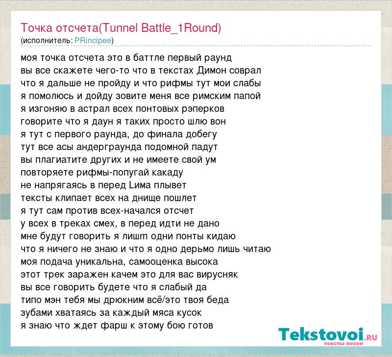 моя точка отсчета это в баттле первый раунд вы все скажете чего-то что в текстах Димон соврал что я дальше не пройду и что рифмы тут мои слабы я помолюсь и дойду зовите меня все римским папой я изгоняю в астрал всех понтовых рэперков говорите что я даун я таких просто шлю вон я тут с первого раунда, до финала добегу тут все асы андерграунда подомной падут вы плагиатите других и не имеете свой ум повторяете рифмы-попугай какаду не напрягаясь в перед Lима плывет тексты клипает всех на днище пошлет я тут сам против всех-начался отсчет у всех в треках смех, в перед идти не дано мне будут говорить я лишm одни понты кидаю что я ничего не знаю и что я одно дерьмо лишь читаю моя подача уникальна, самооценка высока этот трек заражен качем это для вас вирусняк вы все говорить будете что я слабый да типо мэн тебя мы дрюкним всё/это твоя беда зубами хватаясь за каждый мяса кусок я знаю что ждет фарш к этому бою готов