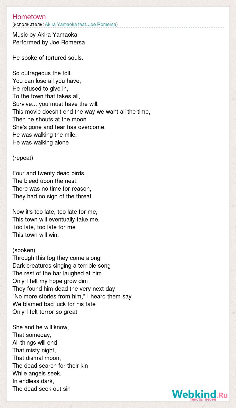 Music by Akira Yamaoka Performed by Joe Romersa He spoke of tortured souls. So outrageous the toll, You can lose all you have, He refused to give in, To the town that takes all, Survive... you must have the will, This movie doesn't end the way we want all the time, Then he shouts at the moon She's gone and fear has overcome, He was walking the mile, He was walking alone (repeat) Four and twenty dead birds, The bleed upon the nest, There was no time for reason, They had no sign of the threat Now it's too late, too late for me, This town will eventually take me, Too late, too late for me This town will win. (spoken) Through this fog they come along Dark creatures singing a terrible song The rest of the bar laughed at him Only I felt my hope grow dim They found him dead the very next day "No more stories from him," I heard them say We blamed bad luck for his fate Only I felt terror so great She and he will know, That someday, All things will end That misty night, That dismal moon, The dead search for their kin While angels seek, In endless dark, The dead seek out sin