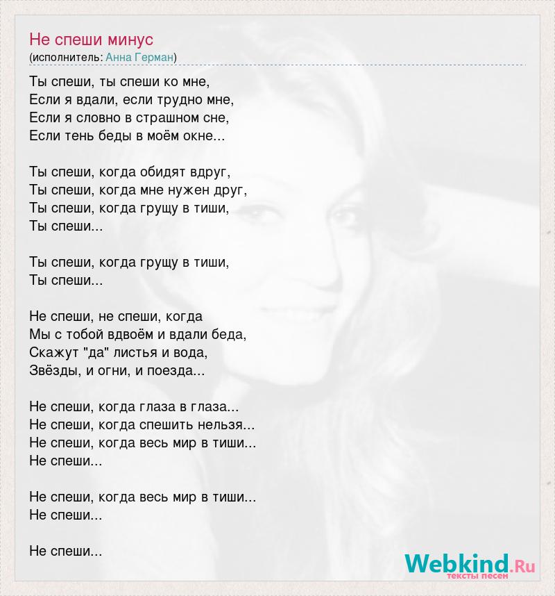 Ты спеши, ты спеши ко мне, Если я вдали, если трудно мне, Если я словно в страшном сне, Если тень беды в моём окне... Ты спеши, когда обидят вдруг, Ты спеши, когда мне нужен друг, Ты спеши, когда грущу в тиши, Ты спеши... Ты спеши, когда грущу в тиши, Ты спеши... Не спеши, не спеши, когда Мы с тобой вдвоём и вдали беда, Скажут "да" листья и вода, Звёзды, и огни, и поезда... Не спеши, когда глаза в глаза... Не спеши, когда спешить нельзя... Не спеши, когда весь мир в тиши... Не спеши... Не спеши, когда весь мир в тиши... Не спеши... Не спеши...