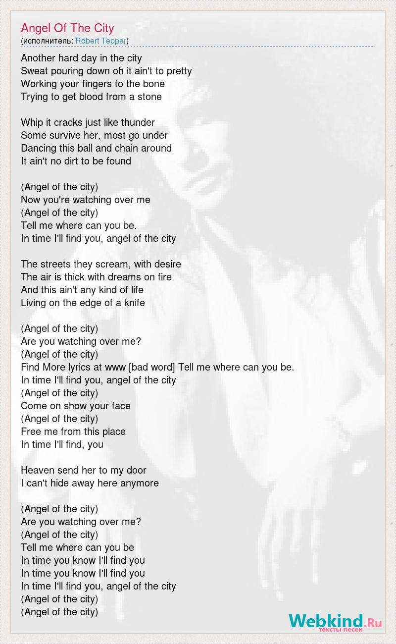 Another hard day in the city Sweat pouring down oh it ain't to pretty Working your fingers to the bone Trying to get blood from a stone Whip it cracks just like thunder Some survive her, most go under Dancing this ball and chain around It ain't no dirt to be found (Angel of the city) Now you're watching over me (Angel of the city) Tell me where can you be. In time I'll find you, angel of the city The streets they scream, with desire The air is thick with dreams on fire And this ain't any kind of life Living on the edge of a knife (Angel of the city) Are you watching over me? (Angel of the city) Find More lyrics at www [bad word] Tell me where can you be. In time I'll find you, angel of the city (Angel of the city) Come on show your face (Angel of the city) Free me from this place In time I'll find, you Heaven send her to my door I can't hide away here anymore (Angel of the city) Are you watching over me? (Angel of the city) Tell me where can you be In time you know I'll find you In time you know I'll find you In time I'll find you, angel of the city (Angel of the city) (Angel of the city)