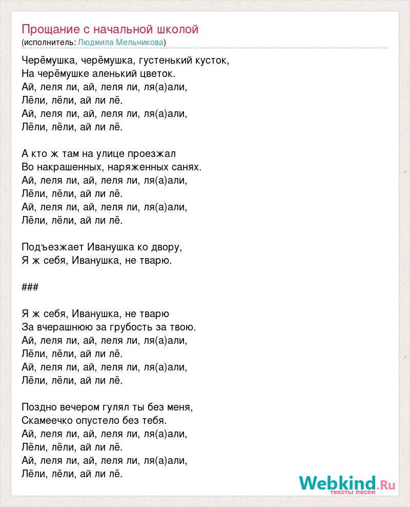Черёмушка, черёмушка, густенький кусток, На черёмушке аленький цветок. Ай, леля ли, ай, леля ли, ля(а)али, Лёли, лёли, ай ли лё. Ай, леля ли, ай, леля ли, ля(а)али, Лёли, лёли, ай ли лё. А кто ж там на улице проезжал Во накрашенных, наряженных санях. Ай, леля ли, ай, леля ли, ля(а)али, Лёли, лёли, ай ли лё. Ай, леля ли, ай, леля ли, ля(а)али, Лёли, лёли, ай ли лё. Подъезжает Иванушка ко двору, Я ж себя, Иванушка, не тварю. ### Я ж себя, Иванушка, не тварю За вчерашнюю за грубость за твою. Ай, леля ли, ай, леля ли, ля(а)али, Лёли, лёли, ай ли лё. Ай, леля ли, ай, леля ли, ля(а)али, Лёли, лёли, ай ли лё. Поздно вечером гулял ты без меня, Скамеечко опустело без тебя. Ай, леля ли, ай, леля ли, ля(а)али, Лёли, лёли, ай ли лё. Ай, леля ли, ай, леля ли, ля(а)али, Лёли, лёли, ай ли лё.