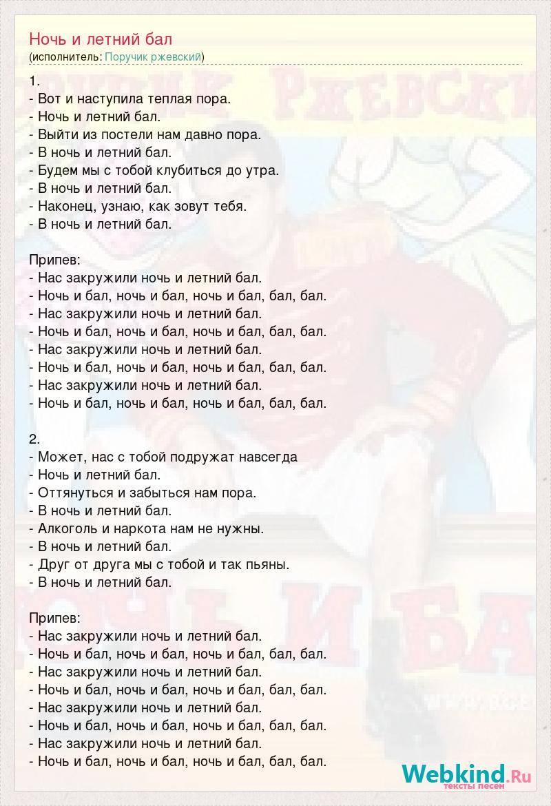 1. - Вот и наступила теплая пора. - Ночь и летний бал. - Выйти из постели нам давно пора. - В ночь и летний бал. - Будем мы с тобой клубиться до утра. - В ночь и летний бал. - Наконец, узнаю, как зовут тебя. - В ночь и летний бал. Припев: - Нас закружили ночь и летний бал. - Ночь и бал, ночь и бал, ночь и бал, бал, бал. - Нас закружили ночь и летний бал. - Ночь и бал, ночь и бал, ночь и бал, бал, бал. - Нас закружили ночь и летний бал. - Ночь и бал, ночь и бал, ночь и бал, бал, бал. - Нас закружили ночь и летний бал. - Ночь и бал, ночь и бал, ночь и бал, бал, бал. 2. - Может, нас с тобой подружат навсегда - Ночь и летний бал. - Оттянуться и забыться нам пора. - В ночь и летний бал. - Алкоголь и наркота нам не нужны. - В ночь и летний бал. - Друг от друга мы с тобой и так пьяны. - В ночь и летний бал. Припев: - Нас закружили ночь и летний бал. - Ночь и бал, ночь и бал, ночь и бал, бал, бал. - Нас закружили ночь и летний бал. - Ночь и бал, ночь и бал, ночь и бал, бал, бал. - Нас закружили ночь и летний бал. - Ночь и бал, ночь и бал, ночь и бал, бал, бал. - Нас закружили ночь и летний бал. - Ночь и бал, ночь и бал, ночь и бал, бал, бал.