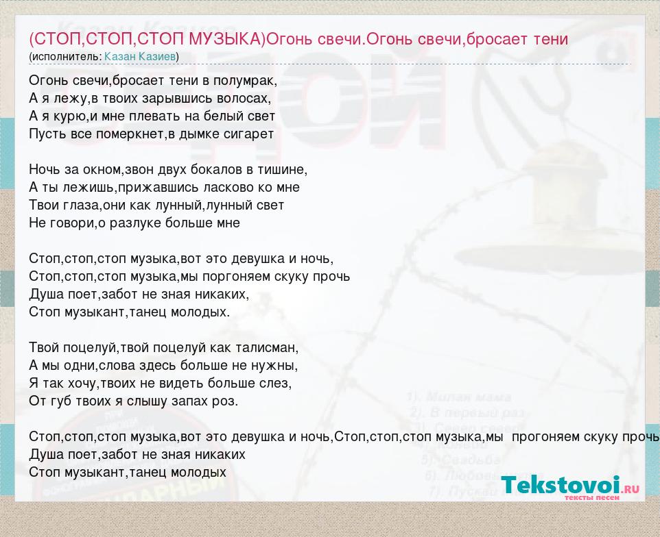 Огонь свечи,бросает тени в полумрак, А я лежу,в твоих зарывшись волосах, А я курю,и мне плевать на белый свет Пусть все померкнет,в дымке сигарет Ночь за окном,звон двух бокалов в тишине, А ты лежишь,прижавшись ласково ко мне Твои глаза,они как лунный,лунный свет Не говори,о разлуке больше мне Стоп,стоп,стоп музыка,вот это девушка и ночь, Стоп,стоп,стоп музыка,мы поргоняем скуку прочь Душа поет,забот не зная никаких, Стоп музыкант,танец молодых. Твой поцелуй,твой поцелуй как талисман, А мы одни,слова здесь больше не нужны, Я так хочу,твоих не видеть больше слез, От губ твоих я слышу запах роз. Стоп,стоп,стоп музыка,вот это девушка и ночь,Стоп,стоп,стоп музыка,мы прогоняем скуку прочь Душа поет,забот не зная никаких Стоп музыкант,танец молодых