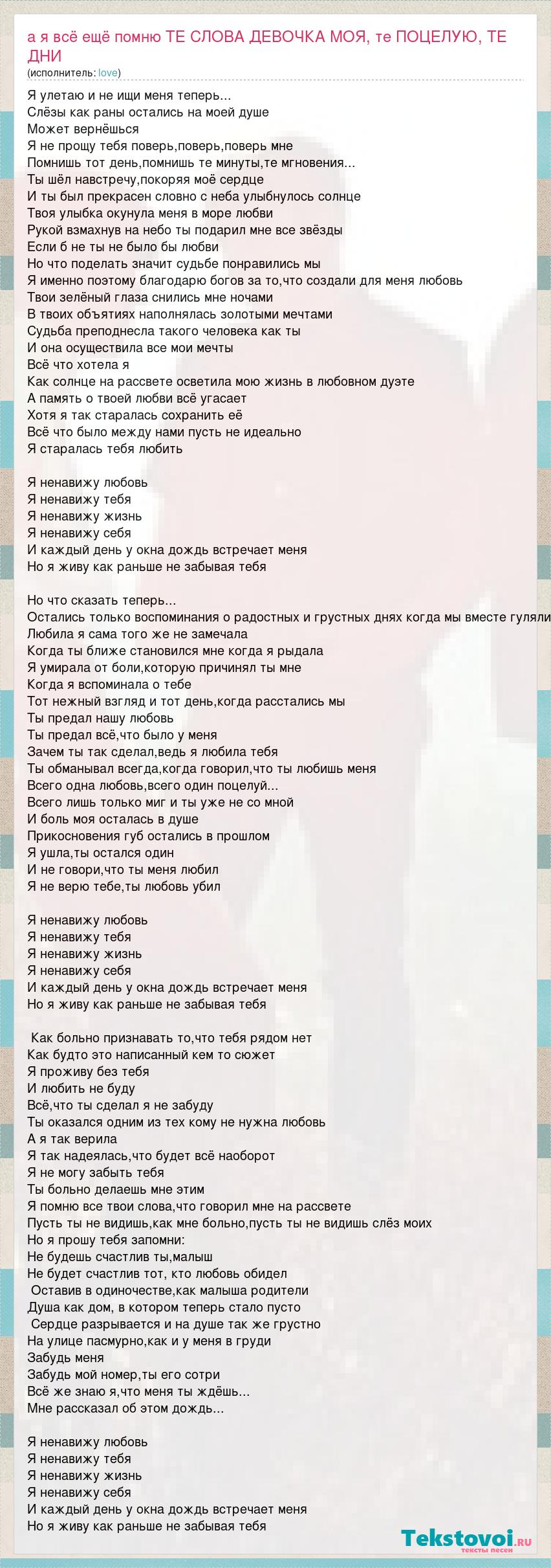 Я улетаю и не ищи меня теперь... Слёзы как раны остались на моей душе Может вернёшься Я не прощу тебя поверь,поверь,поверь мне Помнишь тот день,помнишь те минуты,те мгновения... Ты шёл навстречу,покоряя моё сердце И ты был прекрасен словно с неба улыбнулось солнце Твоя улыбка окунула меня в море любви Рукой взмахнув на небо ты подарил мне все звёзды Если б не ты не было бы любви Но что поделать значит судьбе понравились мы Я именно поэтому благодарю богов за то,что создали для меня любовь Твои зелёный глаза снились мне ночами В твоих объятиях наполнялась золотыми мечтами Судьба преподнесла такого человека как ты И она осуществила все мои мечты Всё что хотела я Как солнце на рассвете осветила мою жизнь в любовном дуэте А память о твоей любви всё угасает Хотя я так старалась сохранить её Всё что было между нами пусть не идеально Я старалась тебя любить Я ненавижу любовь Я ненавижу тебя Я ненавижу жизнь Я ненавижу себя И каждый день у окна дождь встречает меня Но я живу как раньше не забывая тебя Но что сказать теперь... Остались только воспоминания о радостных и грустных днях когда мы вместе гуляли Любила я сама того же не замечала Когда ты ближе становился мне когда я рыдала Я умирала от боли,которую причинял ты мне Когда я вспоминала о тебе Тот нежный взгляд и тот день,когда расстались мы Ты предал нашу любовь Ты предал всё,что было у меня Зачем ты так сделал,ведь я любила тебя Ты обманывал всегда,когда говорил,что ты любишь меня Всего одна любовь,всего один поцелуй... Всего лишь только миг и ты уже не со мной И боль моя осталась в душе Прикосновения губ остались в прошлом Я ушла,ты остался один И не говори,что ты меня любил Я не верю тебе,ты любовь убил Я ненавижу любовь Я ненавижу тебя Я ненавижу жизнь Я ненавижу себя И каждый день у окна дождь встречает меня Но я живу как раньше не забывая тебя Как больно признавать то,что тебя рядом нет Как будто это написанный кем то сюжет Я проживу без тебя И любить не буду Всё,что ты сделал я не забуду Ты оказался одним из тех кому не нужна любовь А я так верила Я так надеялась,что будет всё наоборот Я не могу забыть тебя Ты больно делаешь мне этим Я помню все твои слова,что говорил мне на рассвете Пусть ты не видишь,как мне больно,пусть ты не видишь слёз моих Но я прошу тебя запомни: Не будешь счастлив ты,малыш Не будет счастлив тот, кто любовь обидел Оставив в одиночестве,как малыша родители Душа как дом, в котором теперь стало пусто Сердце разрывается и на душе так же грустно На улице пасмурно,как и у меня в груди Забудь меня Забудь мой номер,ты его сотри Всё же знаю я,что меня ты ждёшь... Мне рассказал об этом дождь... Я ненавижу любовь Я ненавижу тебя Я ненавижу жизнь Я ненавижу себя И каждый день у окна дождь встречает меня Но я живу как раньше не забывая тебя