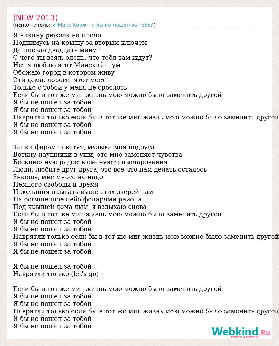 Я накину рюкзак на плечо Поднимусь на крышу за вторым ключем До поезда двадцать минут С чего ты взял, олень, что тебя там ждут? Нет я люблю этот Минский шум Обожаю город в котором живу Эти дома, дороги, этот мост Только с тобой у меня не срослось Если бы в тот же миг жизнь мою можно было заменить другой Я бы не пошел за тобой Я бы не пошел за тобой Наврятли только если бы в тот же миг жизнь мою можно было заменить другой Я бы не пошел за тобой Я бы не пошел за тобой Тачки фарами светят, музыка моя подруга Воткну наушники в уши, это мне заменяет чувства Бесконечную радость сменяют разочарования Люди, любите друг друга, это все что нам делать осталось Знаешь, мне много не надо Немного свободы и время И желания прыгать выше этих зверей там На освященное небо фонарями района Под крышей дома дым, я вздыхаю снова Если бы в тот же миг жизнь мою можно было заменить другой Я бы не пошел за тобой Я бы не пошел за тобой Наврятли только если бы в тот же миг жизнь мою можно было заменить другой Я бы не пошел за тобой Я бы не пошел за тобой Я бы не пошел за тобой Наврятли только (let's go) Если бы в тот же миг жизнь мою можно было заменить другой Я бы не пошел за тобой Я бы не пошел за тобой Наврятли только если бы в тот же миг жизнь мою можно было заменить другой Я бы не пошел за тобой Я бы не пошел за тобой