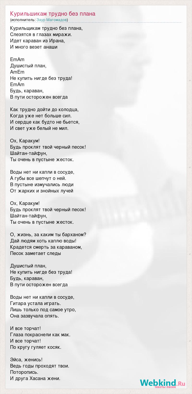 Курильщикам трудно без плана, Слезятся в глазах миражи. Идет караван из Ирана, И много везет анаши EmAm Душистый план, AmEm Не купить нигде без труда! EmAm Будь, караван, В пути осторожен всегда Как трудно дойти до колодца, Когда уже нет больше сил. И сердце как будто не бьется, И свет уже белый не мил. Ох, Каракум! Будь проклят твой черный песок! Шайтан-тайфун, Ты очень в пустыне жесток. Воды нет ни капли в сосуде, А губы все шепчут о ней. В пустыне измучались люди От жарких и знойных лучей Ох, Каракум! Будь проклят твой черный песок! Шайтан-тайфун, Ты очень в пустыне жесток. О, жизнь, за каким ты барханом? Дай людям хоть каплю воды! Крадется смерть за караваном, Песок заметает следы Душистый план, Не купить нигде без труда! Будь, караван, В пути осторожен всегда Воды нет ни капли в сосуде, Гитара устала играть. Лишь только под самое утро, Она зазвучала опять. И все торчат! Глаза покраснели как мак. И все торчат! По кругу гуляет косяк. Эйса, женись! Ведь годы проходят твои. Поторопись. И друга Хасана жени.
