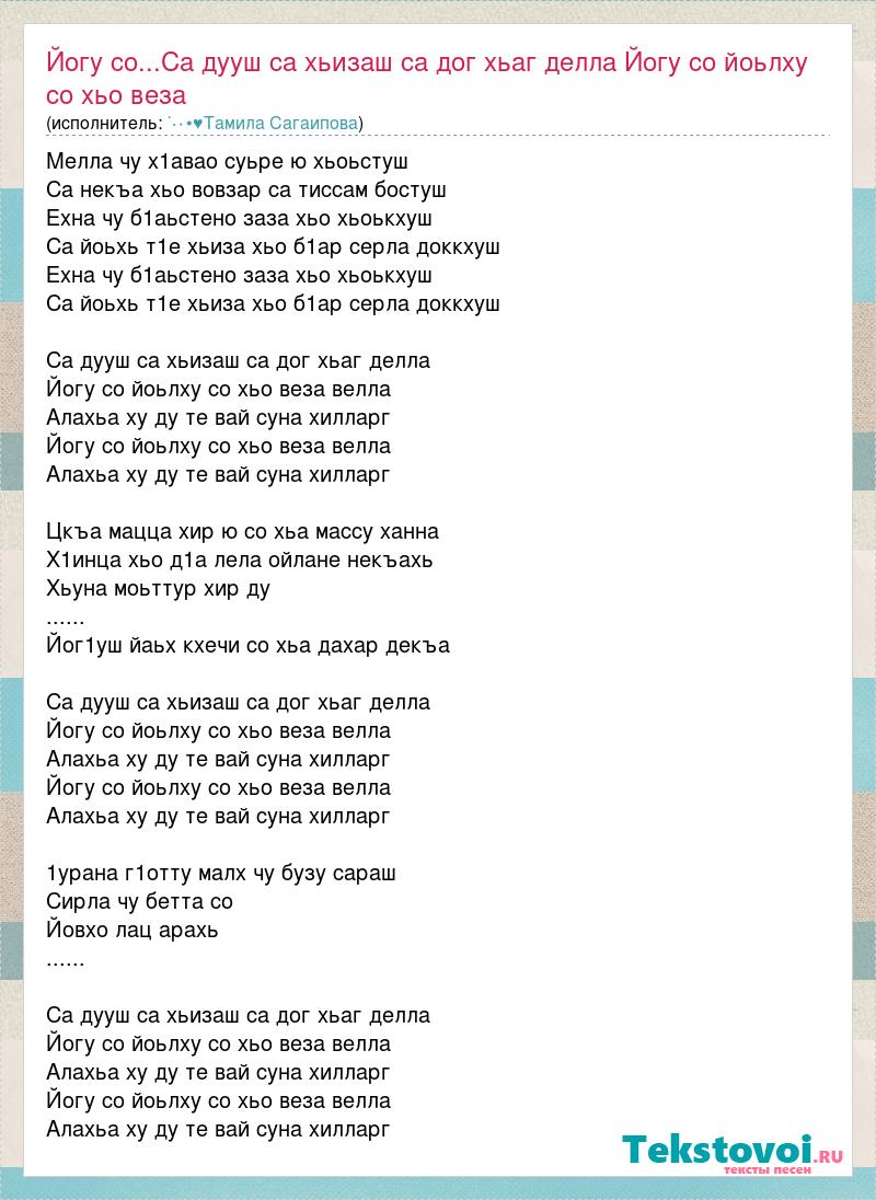 Мелла чу х1авао суьре ю хьоьстуш Са некъа хьо вовзар са тиссам бостуш Ехна чу б1аьстено заза хьо хьоькхуш Са йоьхь т1е хьиза хьо б1ар серла доккхуш Ехна чу б1аьстено заза хьо хьоькхуш Са йоьхь т1е хьиза хьо б1ар серла доккхуш Са дууш са хьизаш са дог хьаг делла Йогу со йоьлху со хьо веза велла Алахьа ху ду те вай суна хилларг Йогу со йоьлху со хьо веза велла Алахьа ху ду те вай суна хилларг Цкъа мацца хир ю со хьа массу ханна Х1инца хьо д1а лела ойлане некъахь Хьуна моьттур хир ду ...... Йог1уш йаьх кхечи со хьа дахар декъа Са дууш са хьизаш са дог хьаг делла Йогу со йоьлху со хьо веза велла Алахьа ху ду те вай суна хилларг Йогу со йоьлху со хьо веза велла Алахьа ху ду те вай суна хилларг 1урана г1отту малх чу бузу сараш Сирла чу бетта со Йовхо лац арахь ...... Са дууш са хьизаш са дог хьаг делла Йогу со йоьлху со хьо веза велла Алахьа ху ду те вай суна хилларг Йогу со йоьлху со хьо веза велла Алахьа ху ду те вай суна хилларг
