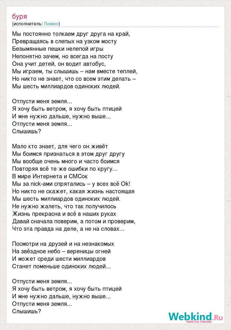 Мы постоянно толкаем друг друга на край, Превращаясь в слепых на узком мосту Безымянные пешки нелепой игры Непонятно зачем, но всегда на посту Она учит детей, он водит автобус, Мы играем, ты слышишь – нам вместе теплей, Но никто не знает, что со всем этим делать – Мы шесть миллиардов одиноких людей. Отпусти меня земля... Я хочу быть ветром, я хочу быть птицей И мне нужно дальше, нужно выше... Отпусти меня земля... Слышишь? Мало кто знает, для чего он живёт Мы боимся признаться в этом друг другу Мы вообще очень много и часто боимся Повторяя всё те же ошибки по кругу... В мире Интернета и СМСок Мы за nick-ами спрятались – у всех всё Ok! Но никто не скажет, какая жизнь настоящая Мы шесть миллиардов одиноких людей. Не нужно жалеть, что так получилось Жизнь прекрасна и всё в наших руках Давай сначала поверим, а потом и проверим, Что эта правда на деле, а не на словах... Посмотри на друзей и на незнакомых На звёздное небо – вереницы огней И может среди шести миллиардов Станет поменьше одиноких людей... Отпусти меня земля... Я хочу быть ветром, я хочу быть птицей И мне нужно дальше, нужно выше... Отпусти меня земля... Слышишь?