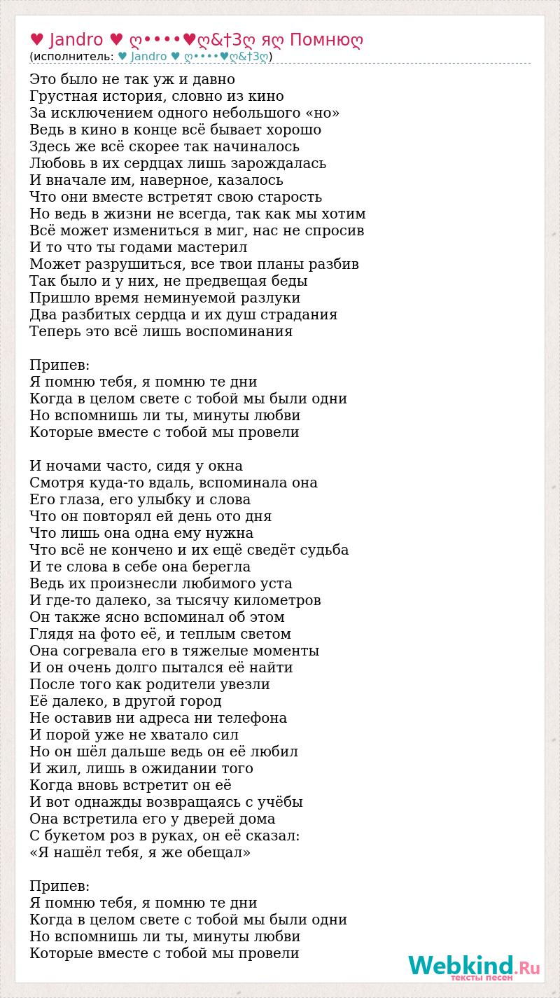 Это было не так уж и давно Грустная история, словно из кино За исключением одного небольшого «но» Ведь в кино в конце всё бывает хорошо Здесь же всё скорее так начиналось Любовь в их сердцах лишь зарождалась И вначале им, наверное, казалось Что они вместе встретят свою старость Но ведь в жизни не всегда, так как мы хотим Всё может измениться в миг, нас не спросив И то что ты годами мастерил Может разрушиться, все твои планы разбив Так было и у них, не предвещая беды Пришло время неминуемой разлуки Два разбитых сердца и их душ страдания Теперь это всё лишь воспоминания Припев: Я помню тебя, я помню те дни Когда в целом свете с тобой мы были одни Но вспомнишь ли ты, минуты любви Которые вместе с тобой мы провели И ночами часто, сидя у окна Смотря куда-то вдаль, вспоминала она Его глаза, его улыбку и слова Что он повторял ей день ото дня Что лишь она одна ему нужна Что всё не кончено и их ещё сведёт судьба И те слова в себе она берегла Ведь их произнесли любимого уста И где-то далеко, за тысячу километров Он также ясно вспоминал об этом Глядя на фото её, и теплым светом Она согревала его в тяжелые моменты И он очень долго пытался её найти После того как родители увезли Её далеко, в другой город Не оставив ни адреса ни телефона И порой уже не хватало сил Но он шёл дальше ведь он её любил И жил, лишь в ожидании того Когда вновь встретит он её И вот однажды возвращаясь с учёбы Она встретила его у дверей дома С букетом роз в руках, он её сказал: «Я нашёл тебя, я же обещал» Припев: Я помню тебя, я помню те дни Когда в целом свете с тобой мы были одни Но вспомнишь ли ты, минуты любви Которые вместе с тобой мы провели