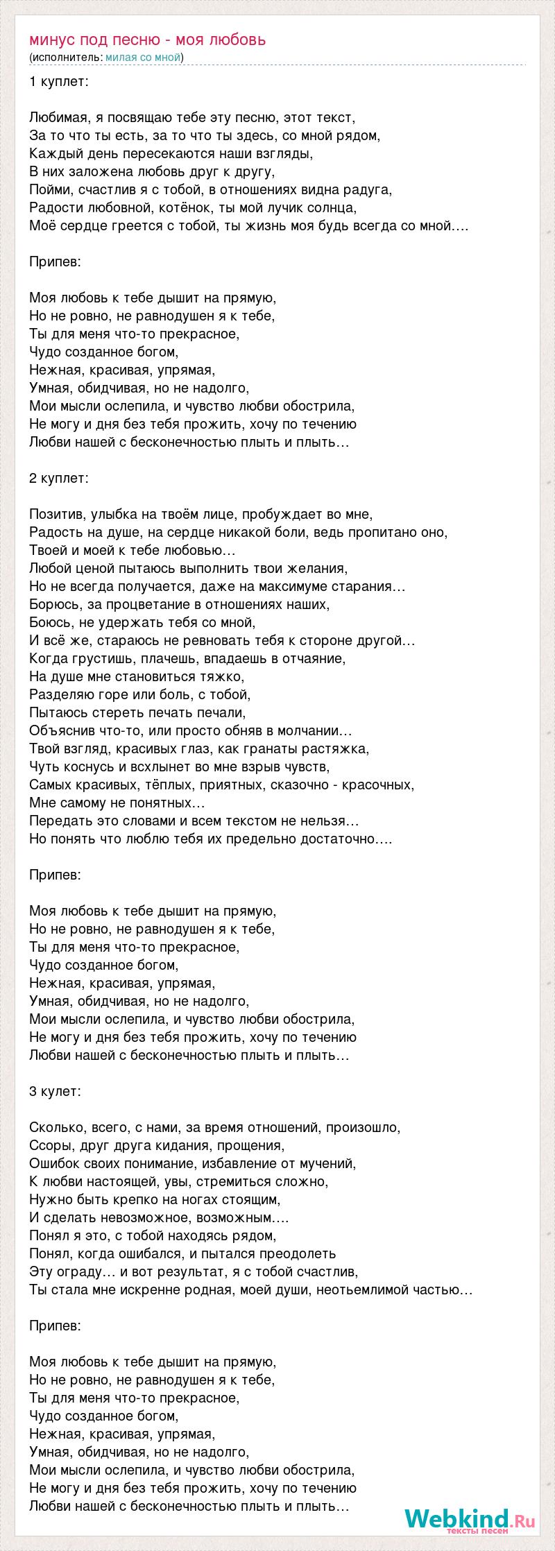 1 куплет: Любимая, я посвящаю тебе эту песню, этот текст, За то что ты есть, за то что ты здесь, со мной рядом, Каждый день пересекаются наши взгляды, В них заложена любовь друг к другу, Пойми, счастлив я с тобой, в отношениях видна радуга, Радости любовной, котёнок, ты мой лучик солнца, Моё сердце греется с тобой, ты жизнь моя будь всегда со мной…. Припев: Моя любовь к тебе дышит на прямую, Но не ровно, не равнодушен я к тебе, Ты для меня что-то прекрасное, Чудо созданное богом, Нежная, красивая, упрямая, Умная, обидчивая, но не надолго, Мои мысли ослепила, и чувство любви обострила, Не могу и дня без тебя прожить, хочу по течению Любви нашей с бесконечностью плыть и плыть… 2 куплет: Позитив, улыбка на твоём лице, пробуждает во мне, Радость на душе, на сердце никакой боли, ведь пропитано оно, Твоей и моей к тебе любовью… Любой ценой пытаюсь выполнить твои желания, Но не всегда получается, даже на максимуме старания… Борюсь, за процветание в отношениях наших, Боюсь, не удержать тебя со мной, И всё же, стараюсь не ревновать тебя к стороне другой… Когда грустишь, плачешь, впадаешь в отчаяние, На душе мне становиться тяжко, Разделяю горе или боль, с тобой, Пытаюсь стереть печать печали, Объяснив что-то, или просто обняв в молчании… Твой взгляд, красивых глаз, как гранаты растяжка, Чуть коснусь и всхлынет во мне взрыв чувств, Самых красивых, тёплых, приятных, сказочно - красочных, Мне самому не понятных… Передать это словами и всем текстом не нельзя… Но понять что люблю тебя их предельно достаточно…. Припев: Моя любовь к тебе дышит на прямую, Но не ровно, не равнодушен я к тебе, Ты для меня что-то прекрасное, Чудо созданное богом, Нежная, красивая, упрямая, Умная, обидчивая, но не надолго, Мои мысли ослепила, и чувство любви обострила, Не могу и дня без тебя прожить, хочу по течению Любви нашей с бесконечностью плыть и плыть… 3 кулет: Сколько, всего, с нами, за время отношений, произошло, Ссоры, друг друга кидания, прощения, Ошибок своих понимание, избавление от мучений, К любви настоящей, увы, стремиться сложно, Нужно быть крепко на ногах стоящим, И сделать невозможное, возможным…. Понял я это, с тобой находясь рядом, Понял, когда ошибался, и пытался преодолеть Эту ограду… и вот результат, я с тобой счастлив, Ты стала мне искренне родная, моей души, неотьемлимой частью… Припев: Моя любовь к тебе дышит на прямую, Но не ровно, не равнодушен я к тебе, Ты для меня что-то прекрасное, Чудо созданное богом, Нежная, красивая, упрямая, Умная, обидчивая, но не надолго, Мои мысли ослепила, и чувство любви обострила, Не могу и дня без тебя прожить, хочу по течению Любви нашей с бесконечностью плыть и плыть…