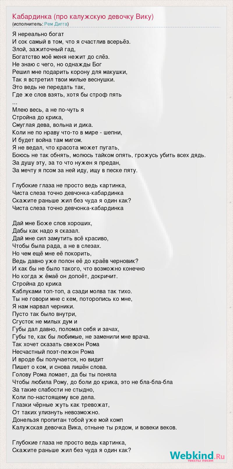 Я нереально богат И сок самый в том, что я счастлив всерьёз. Злой, зажиточный гад, Богатство моё меня нежит до слёз. Не знаю с чего, но однажды Бог Решил мне подарить корону для макушки, Так я встретил твои милые веснушки. Это ведь не передать так, Где же слов взять, хотя бы строф пять ... Млею весь, а не по-чуть я Стройна до крика, Смуглая дева, вольна и дика. Коли не по нраву что-то в мире - шепни, И будет война там мигом. Я не ведал, что красота может пугать, Боюсь не так обнять, молюсь тайком опять, грожусь убить всех дядь. За душу эту, за то что нужен я предан, За мечту я псом за ней иду, ищу в песке пяту. Глубокие глаза не просто ведь картинка, Чиста слеза точно девчонка-кабардинка Скажите раньше жил без чуда я один как? Чиста слеза точно девчонка-кабардинка Дай мне Боже слов хороших, Дабы как надо я сказал. Дай мне сил замутить всё красиво, Чтобы была рада, а не в слезах. Но чем ещё мне её покорить, Ведь давно уже полон её до краёв черновик? И как бы не было такого, что возможно конечно Но когда ж ёмаё он допоёт, докричит. Стройна до крика Каблуками топ-топ, а сзади молва так тихо. Ты не говори мне с кем, поторопись ко мне, Я нам нарвал черники. Пусто так было внутри, Сгусток не милых дум и Губы дал давно, поломал себя и зачах, Губы те, как бы любимые, не заменили мне врача. Так хочет сказать свежон Рома Несчастный поэт-пежон Рома И вроде бы получается, но видит Пишет о ком, и снова лишён слова. Голову Рома ломает, да бы ты поняла Чтобы любила Рому, до боли до крика, это не бла-бла-бла За такие слабости не стыдно, Коли по-настоящему все дела. Глазки чёрные жуть как тревожат, От таких улизнуть невозможно. Донельзя пропитан тобой уже мой комп Калужская девочка Вика, отныне ты рядом, и вовеки веков. Глубокие глаза не просто ведь картинка, Скажите раньше жил без чуда я один как?