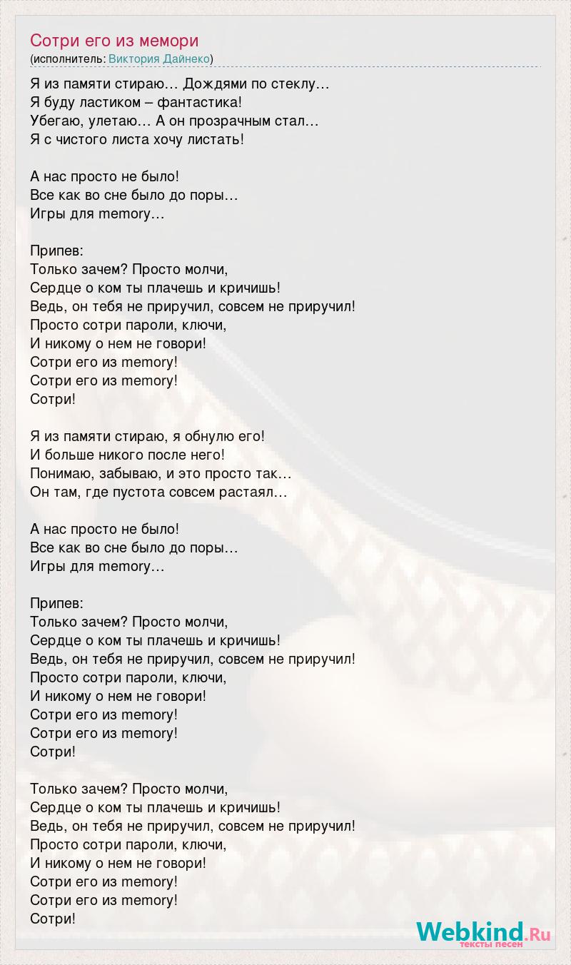 Я из памяти стираю… Дождями по стеклу… Я буду ластиком – фантастика! Убегаю, улетаю… А он прозрачным стал… Я с чистого листа хочу листать! А нас просто не было! Все как во сне было до поры… Игры для memory… Припев: Только зачем? Просто молчи, Сердце о ком ты плачешь и кричишь! Ведь, он тебя не приручил, совсем не приручил! Просто сотри пароли, ключи, И никому о нем не говори! Сотри его из memory! Сотри его из memory! Сотри! Я из памяти стираю, я обнулю его! И больше никого после него! Понимаю, забываю, и это просто так… Он там, где пустота совсем растаял… А нас просто не было! Все как во сне было до поры… Игры для memory… Припев: Только зачем? Просто молчи, Сердце о ком ты плачешь и кричишь! Ведь, он тебя не приручил, совсем не приручил! Просто сотри пароли, ключи, И никому о нем не говори! Сотри его из memory! Сотри его из memory! Сотри! Только зачем? Просто молчи, Сердце о ком ты плачешь и кричишь! Ведь, он тебя не приручил, совсем не приручил! Просто сотри пароли, ключи, И никому о нем не говори! Сотри его из memory! Сотри его из memory! Сотри!
