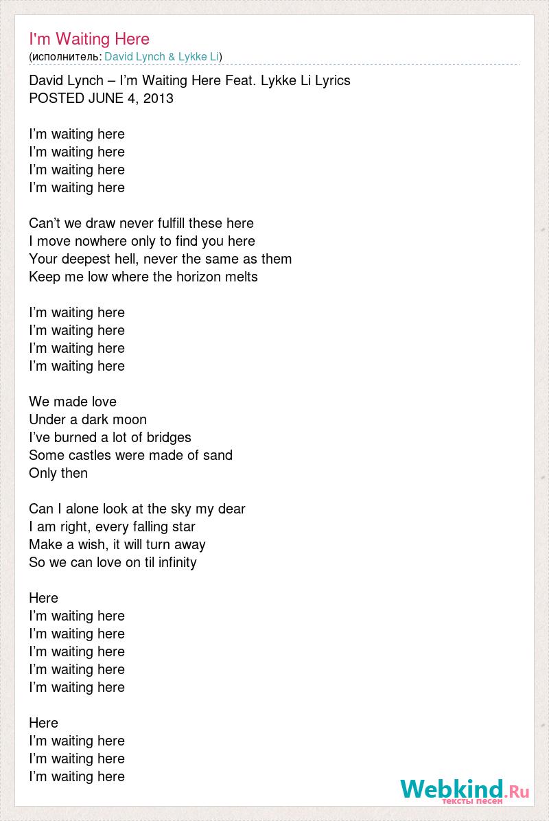 David Lynch – I’m Waiting Here Feat. Lykke Li Lyrics POSTED JUNE 4, 2013 I’m waiting here I’m waiting here I’m waiting here I’m waiting here Can’t we draw never fulfill these here I move nowhere only to find you here Your deepest hell, never the same as them Keep me low where the horizon melts I’m waiting here I’m waiting here I’m waiting here I’m waiting here We made love Under a dark moon I’ve burned a lot of bridges Some castles were made of sand Only then Can I alone look at the sky my dear I am right, every falling star Make a wish, it will turn away So we can love on til infinity Here I’m waiting here I’m waiting here I’m waiting here I’m waiting here I’m waiting here Here I’m waiting here I’m waiting here I’m waiting here
