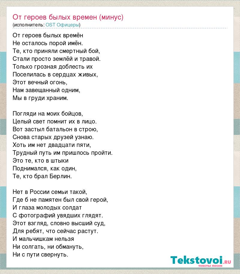От героев былых времён Не осталось порой имён. Те, кто приняли смертный бой, Стали просто землёй и травой. Только грозная доблесть их Поселилась в сердцах живых, Этот вечный огонь, Нам завещанный одним, Мы в груди храним. Погляди на моих бойцов, Целый свет помнит их в лицо. Вот застыл батальон в строю, Снова старых друзей узнаю. Хоть им нет двадцати пяти, Трудный путь им пришлось пройти. Это те, кто в штыки Поднимался, как один, Те, кто брал Берлин. Нет в России семьи такой, Где б не памятен был свой герой, И глаза молодых солдат С фотографий увядших глядят. Этот взгляд, словно высший суд, Для ребят, что сейчас растут. И мальчишкам нельзя Ни солгать, ни обмануть, Ни с пути свернуть.
