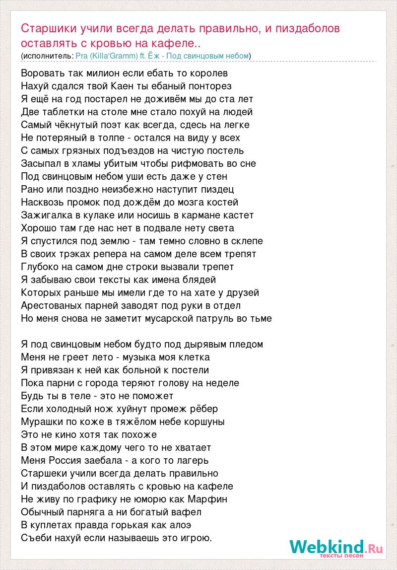 Воровать так милион если ебать то королев Нахуй сдался твой Каен ты ебаный понторез Я ещё на год постарел не доживём мы до ста лет Две таблетки на столе мне стало похуй на людей Самый чёкнутый поэт как всегда, сдесь на легке Не потеряный в толпе - остался на виду у всех С самых грязных подъездов на чистую постель Засыпал в хламы убитым чтобы рифмовать во сне Под свинцовым небом уши есть даже у стен Рано или поздно неизбежно наступит пиздец Насквозь промок под дождём до мозга костей Зажигалка в кулаке или носишь в кармане кастет Хорошо там где нас нет в подвале нету света Я спустился под землю - там темно словно в склепе В своих трэках репера на самом деле всем трепят Глубоко на самом дне строки вызвали трепет Я забываю свои тексты как имена блядей Которых раньше мы имели где то на хате у друзей Арестованых парней заводят под руки в отдел Но меня снова не заметит мусарской патруль во тьме Я под свинцовым небом будто под дырявым пледом Меня не греет лето - музыка моя клетка Я привязан к ней как больной к постели Пока парни с города теряют голову на неделе Будь ты в теле - это не поможет Если холодный нож хуйнут промеж рёбер Мурашки по коже в тяжёлом небе коршуны Это не кино хотя так похоже В этом мире каждому чего то не хватает Меня Россия заебала - а кого то лагерь Старшеки учили всегда делать правильно И пиздаболов оставлять с кровью на кафеле Не живу по графику не юморю как Марфин Обычный парняга а ни богатый вафел В куплетах правда горькая как алоэ Съеби нахуй если называешь это игрою.