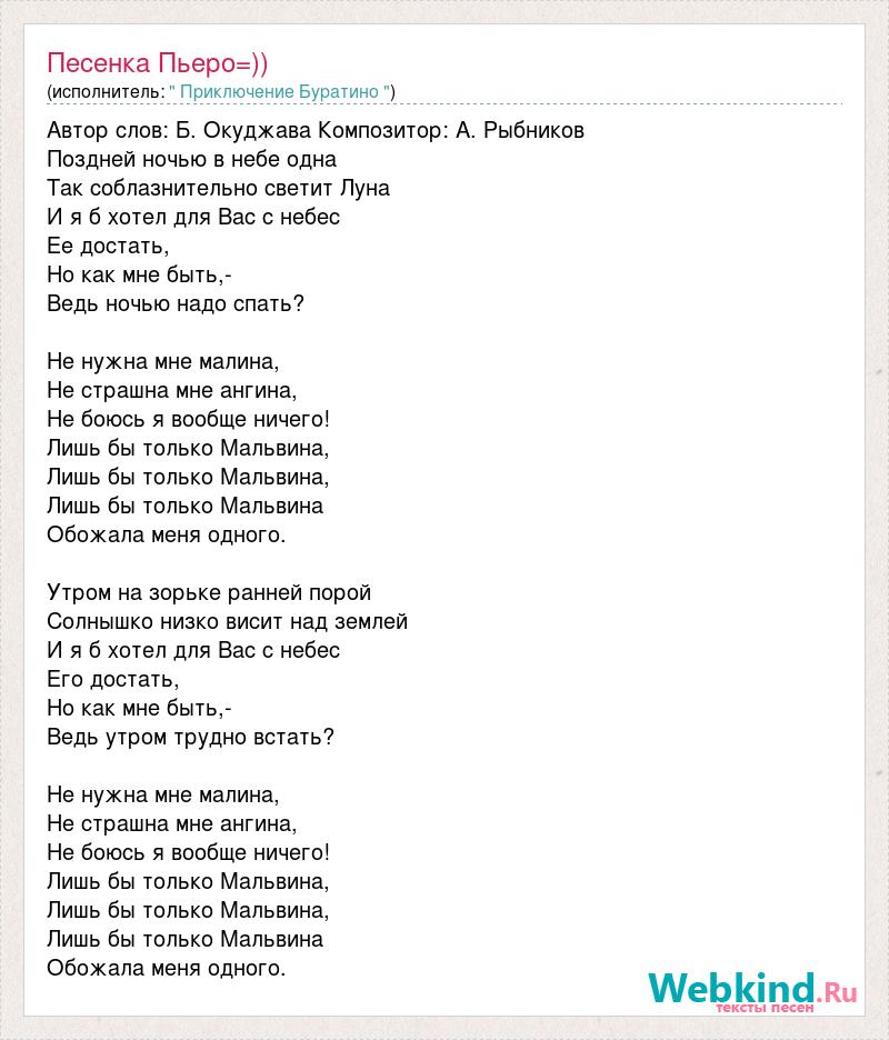 Автор слов: Б. Окуджава Композитор: А. Рыбников Поздней ночью в небе одна Так соблазнительно светит Луна И я б хотел для Вас с небес Ее достать, Но как мне быть,- Ведь ночью надо спать? Не нужна мне малина, Не страшна мне ангина, Не боюсь я вообще ничего! Лишь бы только Мальвина, Лишь бы только Мальвина, Лишь бы только Мальвина Обожала меня одного. Утром на зорьке ранней порой Солнышко низко висит над землей И я б хотел для Вас с небес Его достать, Но как мне быть,- Ведь утром трудно встать? Не нужна мне малина, Не страшна мне ангина, Не боюсь я вообще ничего! Лишь бы только Мальвина, Лишь бы только Мальвина, Лишь бы только Мальвина Обожала меня одного.