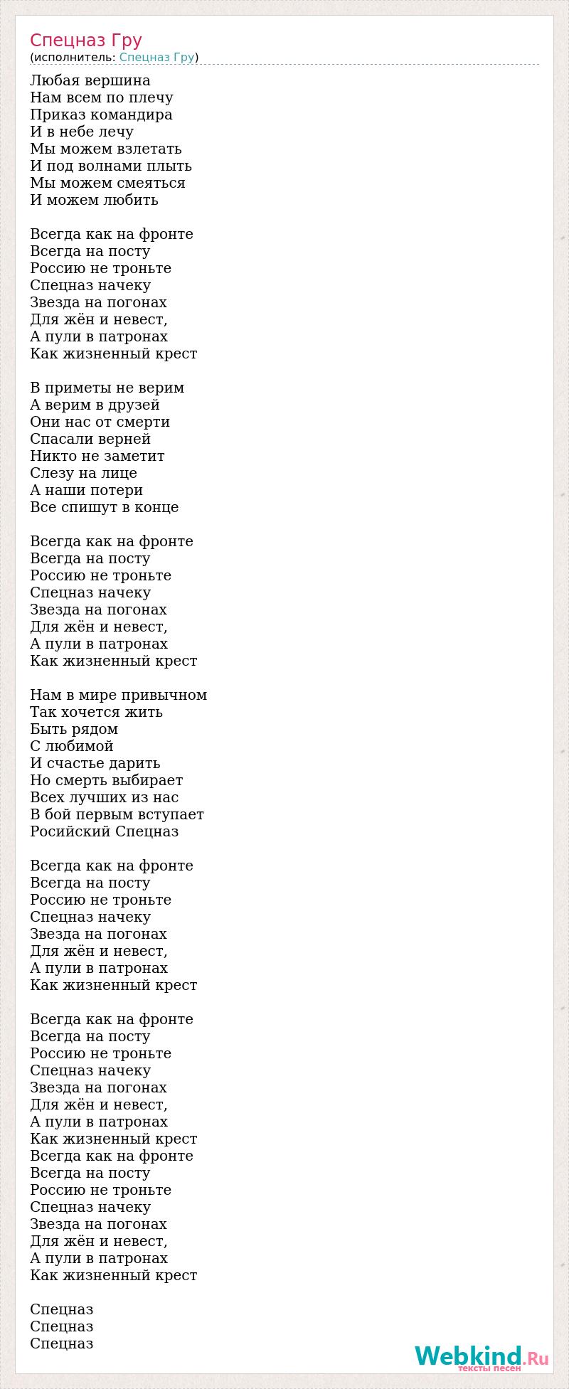 Любая вершина Нам всем по плечу Приказ командира И в небе лечу Мы можем взлетать И под волнами плыть Мы можем смеяться И можем любить Всегда как на фронте Всегда на посту Россию не троньте Спецназ начеку Звезда на погонах Для жён и невест, А пули в патронах Как жизненный крест В приметы не верим А верим в друзей Они нас от смерти Спасали верней Никто не заметит Слезу на лице А наши потери Все спишут в конце Всегда как на фронте Всегда на посту Россию не троньте Спецназ начеку Звезда на погонах Для жён и невест, А пули в патронах Как жизненный крест Нам в мире привычном Так хочется жить Быть рядом С любимой И счастье дарить Но смерть выбирает Всех лучших из нас В бой первым вступает Росийский Спецназ Всегда как на фронте Всегда на посту Россию не троньте Спецназ начеку Звезда на погонах Для жён и невест, А пули в патронах Как жизненный крест Всегда как на фронте Всегда на посту Россию не троньте Спецназ начеку Звезда на погонах Для жён и невест, А пули в патронах Как жизненный крест Всегда как на фронте Всегда на посту Россию не троньте Спецназ начеку Звезда на погонах Для жён и невест, А пули в патронах Как жизненный крест Спецназ Спецназ Спецназ