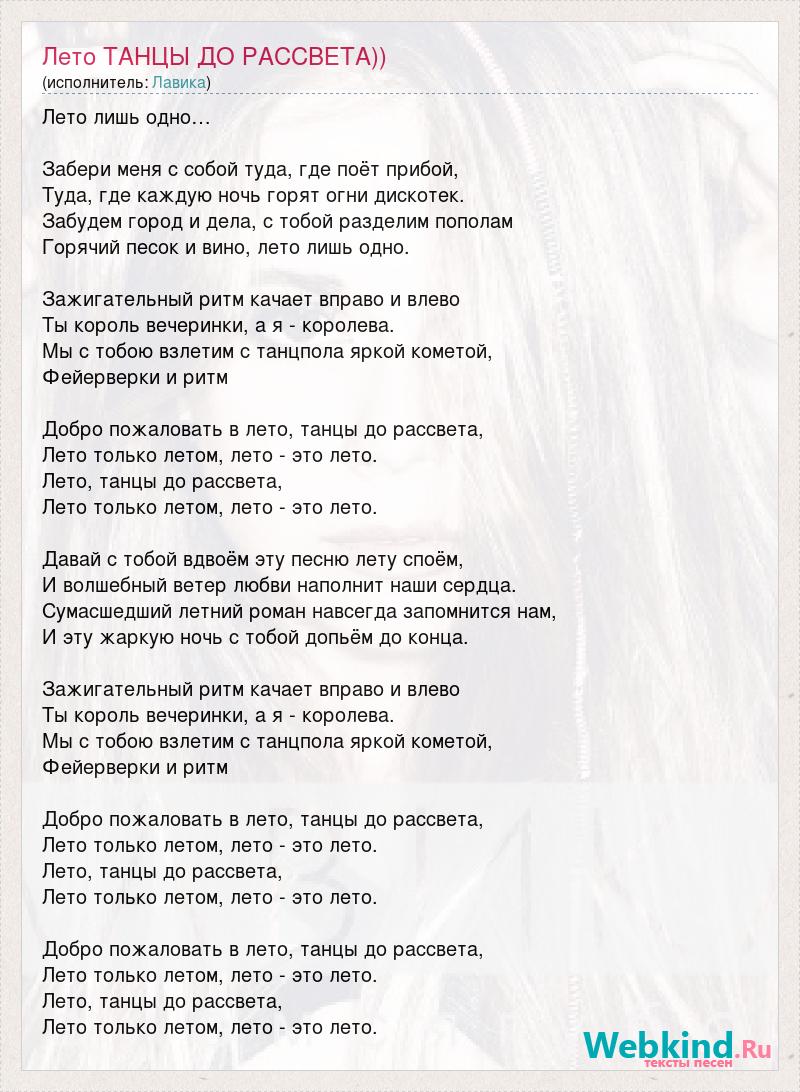 Лето лишь одно… Забери меня с собой туда, где поёт прибой, Туда, где каждую ночь горят огни дискотек. Забудем город и дела, с тобой разделим пополам Горячий песок и вино, лето лишь одно. Зажигательный ритм качает вправо и влево Ты король вечеринки, а я - королева. Мы с тобою взлетим с танцпола яркой кометой, Фейерверки и ритм Добро пожаловать в лето, танцы до рассвета, Лето только летом, лето - это лето. Лето, танцы до рассвета, Лето только летом, лето - это лето. Давай с тобой вдвоём эту песню лету споём, И волшебный ветер любви наполнит наши сердца. Сумасшедший летний роман навсегда запомнится нам, И эту жаркую ночь с тобой допьём до конца. Зажигательный ритм качает вправо и влево Ты король вечеринки, а я - королева. Мы с тобою взлетим с танцпола яркой кометой, Фейерверки и ритм Добро пожаловать в лето, танцы до рассвета, Лето только летом, лето - это лето. Лето, танцы до рассвета, Лето только летом, лето - это лето. Добро пожаловать в лето, танцы до рассвета, Лето только летом, лето - это лето. Лето, танцы до рассвета, Лето только летом, лето - это лето.