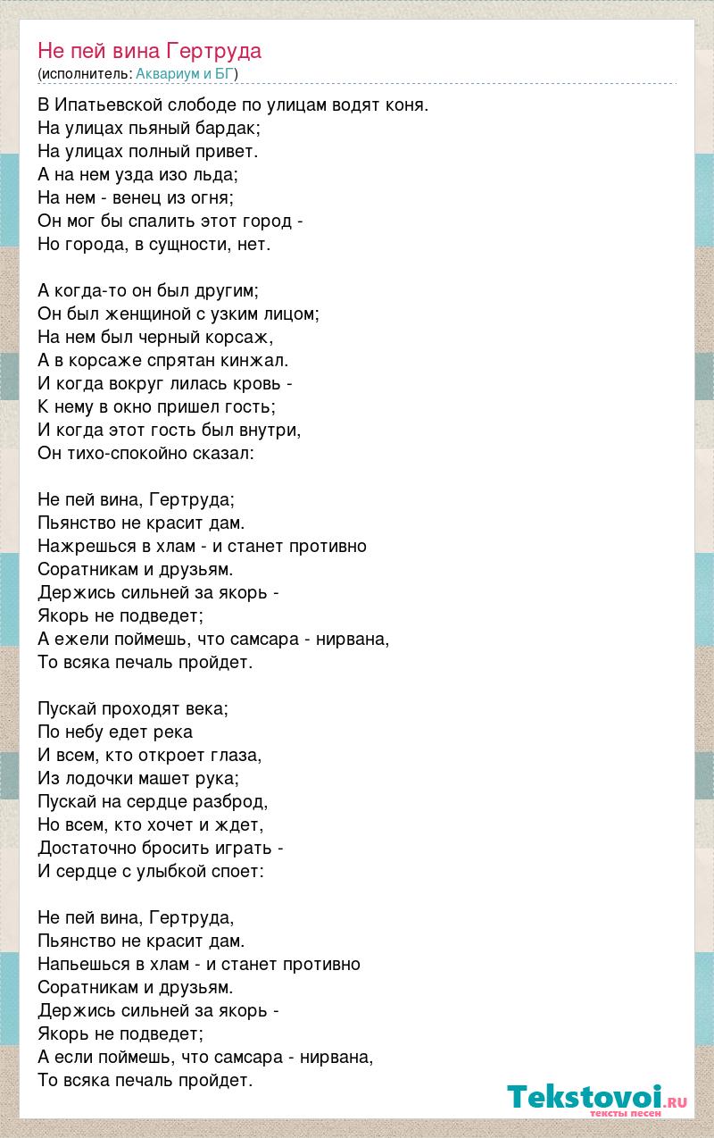 В Ипатьевской слободе по улицам водят коня. На улицах пьяный бардак; На улицах полный привет. А на нем узда изо льда; На нем - венец из огня; Он мог бы спалить этот город - Но города, в сущности, нет. А когда-то он был другим; Он был женщиной с узким лицом; На нем был черный корсаж, А в корсаже спрятан кинжал. И когда вокруг лилась кровь - К нему в окно пришел гость; И когда этот гость был внутри, Он тихо-спокойно сказал: Не пей вина, Гертруда; Пьянство не красит дам. Нажрешься в хлам - и станет противно Соратникам и друзьям. Держись сильней за якорь - Якорь не подведет; А ежели поймешь, что самсара - нирвана, То всяка печаль пройдет. Пускай проходят века; По небу едет река И всем, кто откроет глаза, Из лодочки машет рука; Пускай на сердце разброд, Но всем, кто хочет и ждет, Достаточно бросить играть - И сердце с улыбкой споет: Не пей вина, Гертруда, Пьянство не красит дам. Напьешься в хлам - и станет противно Соратникам и друзьям. Держись сильней за якорь - Якорь не подведет; А если поймешь, что самсара - нирвана, То всяка печаль пройдет.