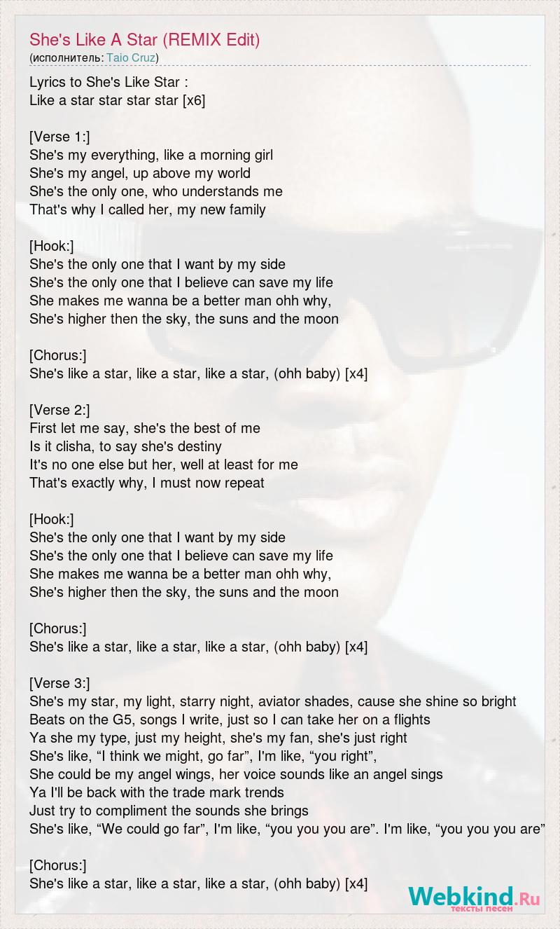 Lyrics to She's Like Star : Like a star star star star [x6] [Verse 1:] She's my everything, like a morning girl She's my angel, up above my world She's the only one, who understands me That's why I called her, my new family [Hook:] She's the only one that I want by my side She's the only one that I believe can save my life She makes me wanna be a better man ohh why, She's higher then the sky, the suns and the moon [Chorus:] She's like a star, like a star, like a star, (ohh baby) [x4] [Verse 2:] First let me say, she's the best of me Is it clisha, to say she's destiny It's no one else but her, well at least for me That's exactly why, I must now repeat [Hook:] She's the only one that I want by my side She's the only one that I believe can save my life She makes me wanna be a better man ohh why, She's higher then the sky, the suns and the moon [Chorus:] She's like a star, like a star, like a star, (ohh baby) [x4] [Verse 3:] She's my star, my light, starry night, aviator shades, cause she shine so bright Beats on the G5, songs I write, just so I can take her on a flights Ya she my type, just my height, she's my fan, she's just right She's like, “I think we might, go far”, I'm like, “you right”, She could be my angel wings, her voice sounds like an angel sings Ya I'll be back with the trade mark trends Just try to compliment the sounds she brings She's like, “We could go far”, I'm like, “you you you are”. I'm like, “you you you are” [Chorus:] She's like a star, like a star, like a star, (ohh baby) [x4]