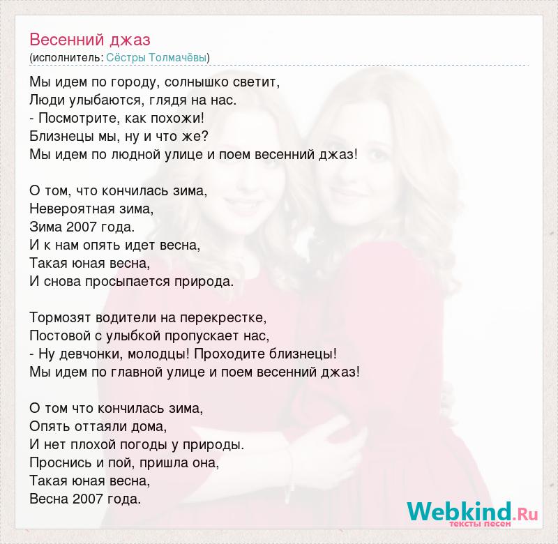 Мы идем по городу, солнышко светит, Люди улыбаются, глядя на нас. - Посмотрите, как похожи! Близнецы мы, ну и что же? Мы идем по людной улице и поем весенний джаз! О том, что кончилась зима, Невероятная зима, Зима 2007 года. И к нам опять идет весна, Такая юная весна, И снова просыпается природа. Тормозят водители на перекрестке, Постовой с улыбкой пропускает нас, - Ну девчонки, молодцы! Проходите близнецы! Мы идем по главной улице и поем весенний джаз! О том что кончилась зима, Опять оттаяли дома, И нет плохой погоды у природы. Проснись и пой, пришла она, Такая юная весна, Весна 2007 года.