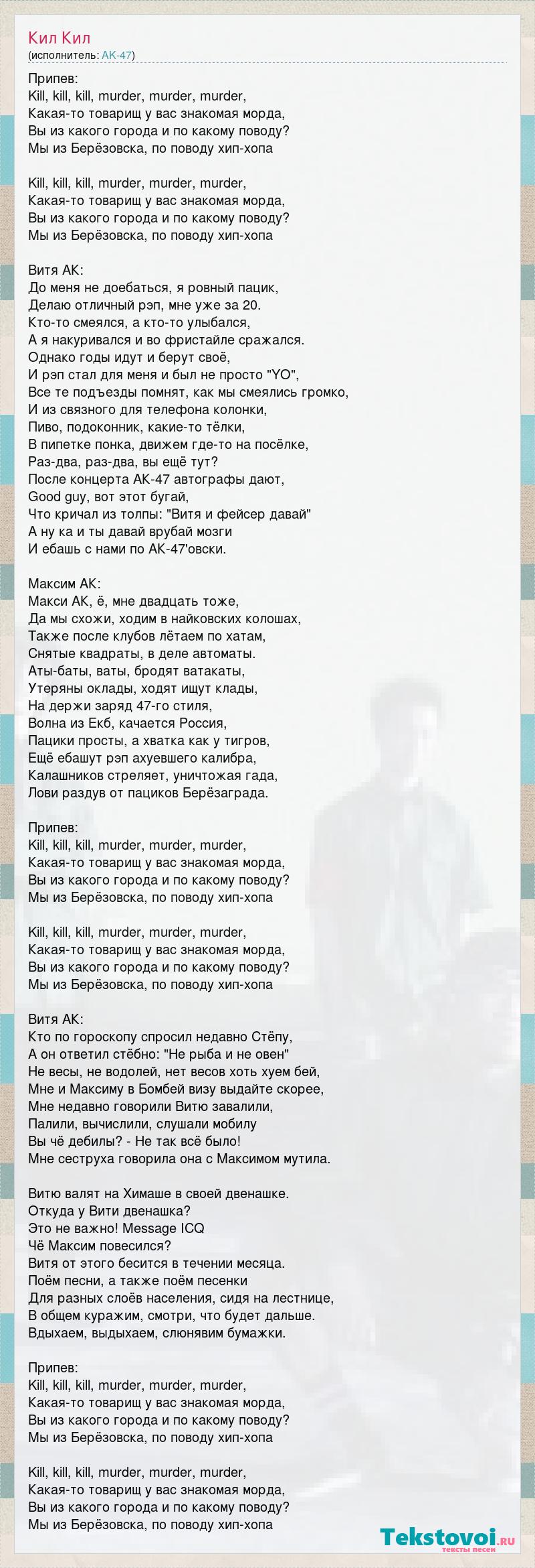 Припев: Kill, kill, kill, murder, murder, murder, Какая-то товарищ у вас знакомая морда, Вы из какого города и по какому поводу? Мы из Берёзовска, по поводу хип-хопа Kill, kill, kill, murder, murder, murder, Какая-то товарищ у вас знакомая морда, Вы из какого города и по какому поводу? Мы из Берёзовска, по поводу хип-хопа Витя АК: До меня не доебаться, я ровный пацик, Делаю отличный рэп, мне уже за 20. Кто-то смеялся, а кто-то улыбался, А я накуривался и во фристайле сражался. Однако годы идут и берут своё, И рэп стал для меня и был не просто "YO", Все те подъезды помнят, как мы смеялись громко, И из связного для телефона колонки, Пиво, подоконник, какие-то тёлки, В пипетке понка, движем где-то на посёлке, Раз-два, раз-два, вы ещё тут? После концерта АК-47 автографы дают, Good guy, вот этот бугай, Что кричал из толпы: "Витя и фейсер давай" А ну ка и ты давай врубай мозги И ебашь с нами по АК-47'овски. Максим АК: Макси АК, ё, мне двадцать тоже, Да мы схожи, ходим в найковских колошах, Также после клубов лётаем по хатам, Снятые квадраты, в деле автоматы. Аты-баты, ваты, бродят ватакаты, Утеряны оклады, ходят ищут клады, На держи заряд 47-го стиля, Волна из Екб, качается Россия, Пацики просты, а хватка как у тигров, Ещё ебашут рэп ахуевшего калибра, Калашников стреляет, уничтожая гада, Лови раздув от пациков Берёзаграда. Припев: Kill, kill, kill, murder, murder, murder, Какая-то товарищ у вас знакомая морда, Вы из какого города и по какому поводу? Мы из Берёзовска, по поводу хип-хопа Kill, kill, kill, murder, murder, murder, Какая-то товарищ у вас знакомая морда, Вы из какого города и по какому поводу? Мы из Берёзовска, по поводу хип-хопа Витя АК: Кто по гороскопу спросил недавно Стёпу, А он ответил стёбно: "Не рыба и не овен" Не весы, не водолей, нет весов хоть хуем бей, Мне и Максиму в Бомбей визу выдайте скорее, Мне недавно говорили Витю завалили, Палили, вычислили, слушали мобилу Вы чё дебилы? - Не так всё было! Мне сеструха говорила она с Максимом мутила. Витю валят на Химаше в своей двенашке. Откуда у Вити двенашка? Это не важно! Message ICQ Чё Максим повесился? Витя от этого бесится в течении месяца. Поём песни, а также поём песенки Для разных слоёв населения, сидя на лестнице, В общем куражим, смотри, что будет дальше. Вдыхаем, выдыхаем, слюнявим бумажки. Припев: Kill, kill, kill, murder, murder, murder, Какая-то товарищ у вас знакомая морда, Вы из какого города и по какому поводу? Мы из Берёзовска, по поводу хип-хопа Kill, kill, kill, murder, murder, murder, Какая-то товарищ у вас знакомая морда, Вы из какого города и по какому поводу? Мы из Берёзовска, по поводу хип-хопа