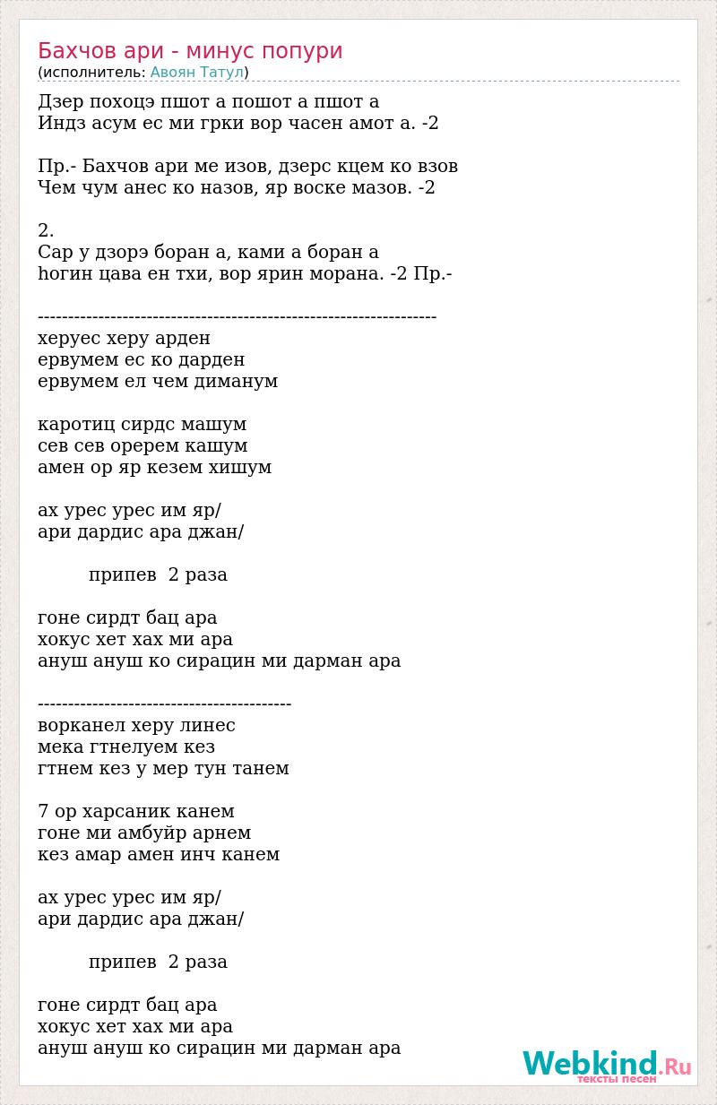 А как ты думаешь, о чем песня "Бахчов ари - минус попури" ?
