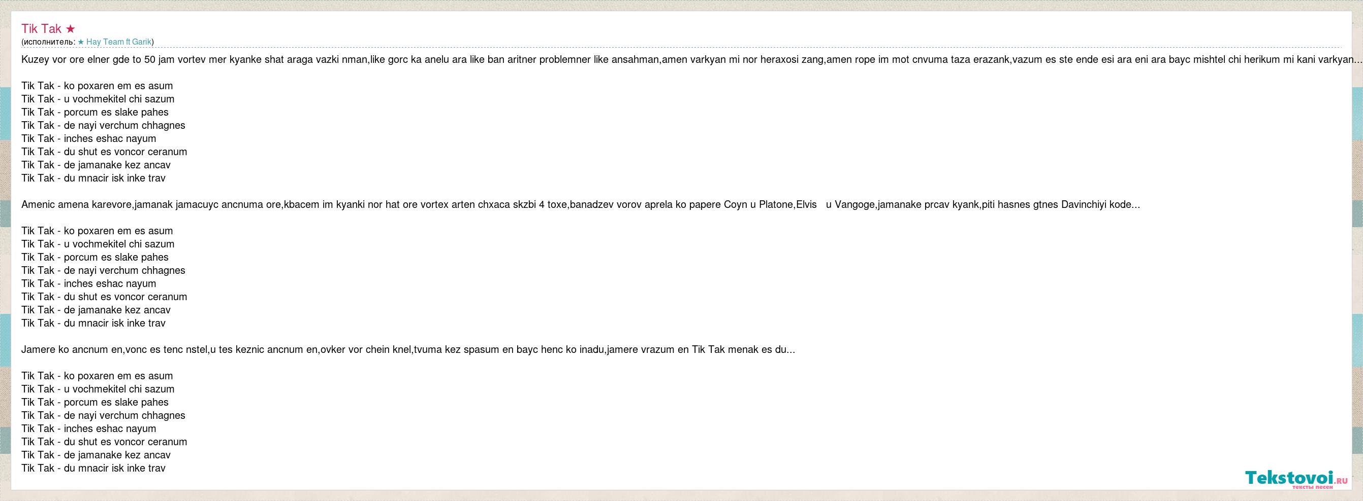 Kuzey vor ore elner gde to 50 jam vortev mer kyanke shat araga vazki nman,like gorc ka anelu ara like ban aritner problemner like ansahman,amen varkyan mi nor heraxosi zang,amen rope im mot cnvuma taza erazank,vazum es ste ende esi ara eni ara bayc mishtel chi herikum mi kani varkyan... Tik Tak - ko poxaren em es asum Tik Tak - u vochmekitel chi sazum Tik Tak - porcum es slake pahes Tik Tak - de nayi verchum chhagnes Tik Tak - inches eshac nayum Tik Tak - du shut es voncor ceranum Tik Tak - de jamanake kez ancav Tik Tak - du mnacir isk inke trav Amenic amena karevore,jamanak jamacuyc ancnuma ore,kbacem im kyanki nor hat ore vortex arten chxaca skzbi 4 toxe,banadzev vorov aprela ko papere Coyn u Platone,Elvis u Vangoge,jamanake prcav kyank,piti hasnes gtnes Davinchiyi kode... Tik Tak - ko poxaren em es asum Tik Tak - u vochmekitel chi sazum Tik Tak - porcum es slake pahes Tik Tak - de nayi verchum chhagnes Tik Tak - inches eshac nayum Tik Tak - du shut es voncor ceranum Tik Tak - de jamanake kez ancav Tik Tak - du mnacir isk inke trav Jamere ko ancnum en,vonc es tenc nstel,u tes keznic ancnum en,ovker vor chein knel,tvuma kez spasum en bayc henc ko inadu,jamere vrazum en Tik Tak menak es du... Tik Tak - ko poxaren em es asum Tik Tak - u vochmekitel chi sazum Tik Tak - porcum es slake pahes Tik Tak - de nayi verchum chhagnes Tik Tak - inches eshac nayum Tik Tak - du shut es voncor ceranum Tik Tak - de jamanake kez ancav Tik Tak - du mnacir isk inke trav