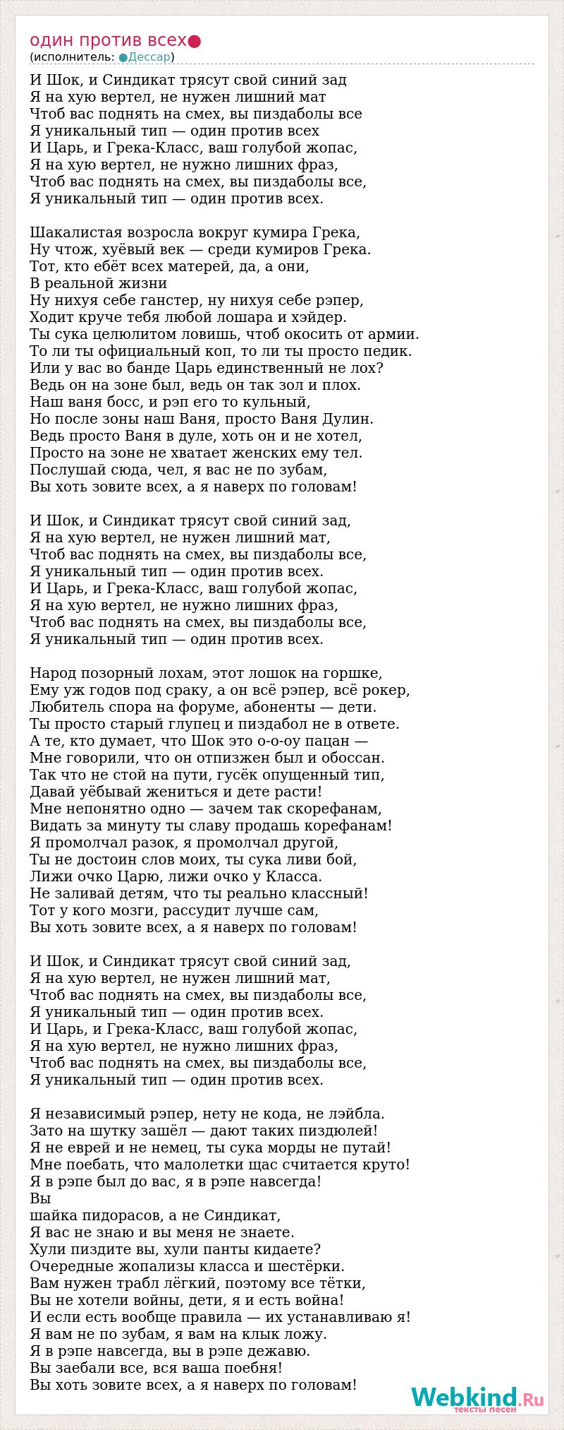 И Шок, и Синдикат трясут свой синий зад Я на хую вертел, не нужен лишний мат Чтоб вас поднять на смех, вы пиздаболы все Я уникальный тип — один против всех И Царь, и Грека-Класс, ваш голубой жопас, Я на хую вертел, не нужно лишних фраз, Чтоб вас поднять на смех, вы пиздаболы все, Я уникальный тип — один против всех. Шакалистая возросла вокруг кумира Грека, Ну чтож, хуёвый век — среди кумиров Грека. Тот, кто ебёт всех матерей, да, а они, В реальной жизни Ну нихуя себе ганстер, ну нихуя себе рэпер, Ходит круче тебя любой лошара и хэйдер. Ты сука целюлитом ловишь, чтоб окосить от армии. То ли ты официальный коп, то ли ты просто педик. Или у вас во банде Царь единственный не лох? Ведь он на зоне был, ведь он так зол и плох. Наш ваня босс, и рэп его то кульный, Но после зоны наш Ваня, просто Ваня Дулин. Ведь просто Ваня в дуле, хоть он и не хотел, Просто на зоне не хватает женских ему тел. Послушай сюда, чел, я вас не по зубам, Вы хоть зовите всех, а я наверх по головам! И Шок, и Синдикат трясут свой синий зад, Я на хую вертел, не нужен лишний мат, Чтоб вас поднять на смех, вы пиздаболы все, Я уникальный тип — один против всех. И Царь, и Грека-Класс, ваш голубой жопас, Я на хую вертел, не нужно лишних фраз, Чтоб вас поднять на смех, вы пиздаболы все, Я уникальный тип — один против всех. Народ позорный лохам, этот лошок на горшке, Ему уж годов под сраку, а он всё рэпер, всё рокер, Любитель спора на форуме, абоненты — дети. Ты просто старый глупец и пиздабол не в ответе. А те, кто думает, что Шок это о-о-оу пацан — Мне говорили, что он отпизжен был и обоссан. Так что не стой на пути, гусёк опущенный тип, Давай уёбывай жениться и дете расти! Мне непонятно одно — зачем так скорефанам, Видать за минуту ты славу продашь корефанам! Я промолчал разок, я промолчал другой, Ты не достоин слов моих, ты сука ливи бой, Лижи очко Царю, лижи очко у Класса. Не заливай детям, что ты реально классный! Тот у кого мозги, рассудит лучше сам, Вы хоть зовите всех, а я наверх по головам! И Шок, и Синдикат трясут свой синий зад, Я на хую вертел, не нужен лишний мат, Чтоб вас поднять на смех, вы пиздаболы все, Я уникальный тип — один против всех. И Царь, и Грека-Класс, ваш голубой жопас, Я на хую вертел, не нужно лишних фраз, Чтоб вас поднять на смех, вы пиздаболы все, Я уникальный тип — один против всех. Я независимый рэпер, нету не кода, не лэйбла. Зато на шутку зашёл — дают таких пиздюлей! Я не еврей и не немец, ты сука морды не путай! Мне поебать, что малолетки щас считается круто! Я в рэпе был до вас, я в рэпе навсегда! Вы шайка пидорасов, а не Синдикат, Я вас не знаю и вы меня не знаете. Хули пиздите вы, хули панты кидаете? Очередные жопализы класса и шестёрки. Вам нужен трабл лёгкий, поэтому все тётки, Вы не хотели войны, дети, я и есть война! И если есть вообще правила — их устанавливаю я! Я вам не по зубам, я вам на клык ложу. Я в рэпе навсегда, вы в рэпе дежавю. Вы заебали все, вся ваша поебня! Вы хоть зовите всех, а я наверх по головам!
