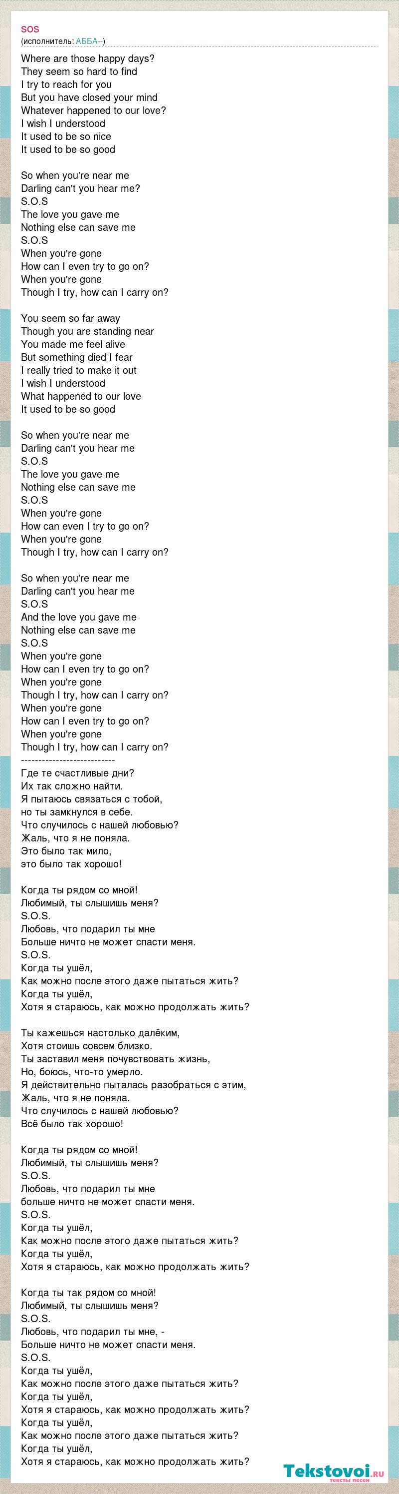 Where are those happy days? They seem so hard to find I try to reach for you But you have closed your mind Whatever happened to our love? I wish I understood It used to be so nice It used to be so good So when you're near me Darling can't you hear me? S.O.S The love you gave me Nothing else can save me S.O.S When you're gone How can I even try to go on? When you're gone Though I try, how can I carry on? You seem so far away Though you are standing near You made me feel alive But something died I fear I really tried to make it out I wish I understood What happened to our love It used to be so good So when you're near me Darling can't you hear me S.O.S The love you gave me Nothing else can save me S.O.S When you're gone How can even I try to go on? When you're gone Though I try, how can I carry on? So when you're near me Darling can't you hear me S.O.S And the love you gave me Nothing else can save me S.O.S When you're gone How can I even try to go on? When you're gone Though I try, how can I carry on? When you're gone How can I even try to go on? When you're gone Though I try, how can I carry on? --------------------------- Где те счастливые дни? Их так сложно найти. Я пытаюсь связаться с тобой, но ты замкнулся в себе. Что случилось с нашей любовью? Жаль, что я не поняла. Это было так мило, это было так хорошо! Когда ты рядом со мной! Любимый, ты слышишь меня? S.O.S. Любовь, что подарил ты мне Больше ничто не может спасти меня. S.O.S. Когда ты ушёл, Как можно после этого даже пытаться жить? Когда ты ушёл, Хотя я стараюсь, как можно продолжать жить? Ты кажешься настолько далёким, Хотя стоишь совсем близко. Ты заставил меня почувствовать жизнь, Но, боюсь, что-то умерло. Я действительно пыталась разобраться с этим, Жаль, что я не поняла. Что случилось с нашей любовью? Всё было так хорошо! Когда ты рядом со мной! Любимый, ты слышишь меня? S.O.S. Любовь, что подарил ты мне больше ничто не может спасти меня. S.O.S. Когда ты ушёл, Как можно после этого даже пытаться жить? Когда ты ушёл, Хотя я стараюсь, как можно продолжать жить? Когда ты так рядом со мной! Любимый, ты слышишь меня? S.O.S. Любовь, что подарил ты мне, - Больше ничто не может спасти меня. S.O.S. Когда ты ушёл, Как можно после этого даже пытаться жить? Когда ты ушёл, Хотя я стараюсь, как можно продолжать жить? Когда ты ушёл, Как можно после этого даже пытаться жить? Когда ты ушёл, Хотя я стараюсь, как можно продолжать жить?
